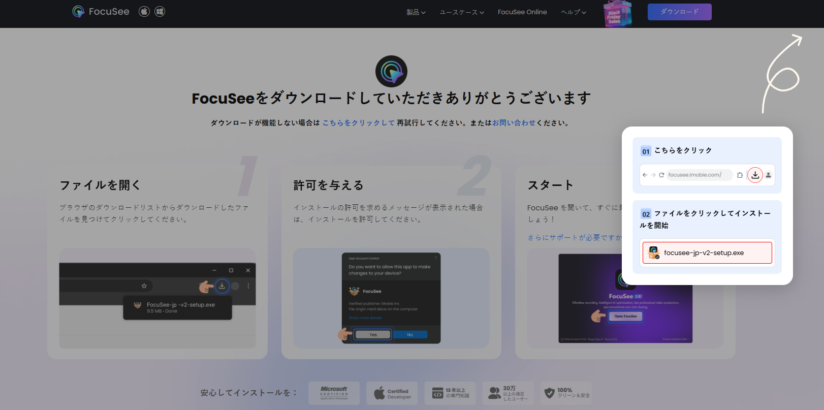 公式ウェブサイトにアクセスして、FocuSeeをダウンロードおよびインストールします。FocuSeeはWindowsまたはmacOSで利用できます。