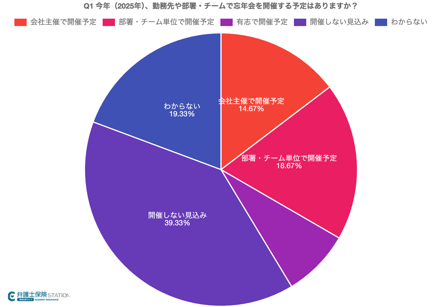「開催しない見込み」が約39.3%で最も多く、「会社主催」14.67%、「部署・チーム単位」18.67%。忘年会を予定している人は全体の約4割でした。