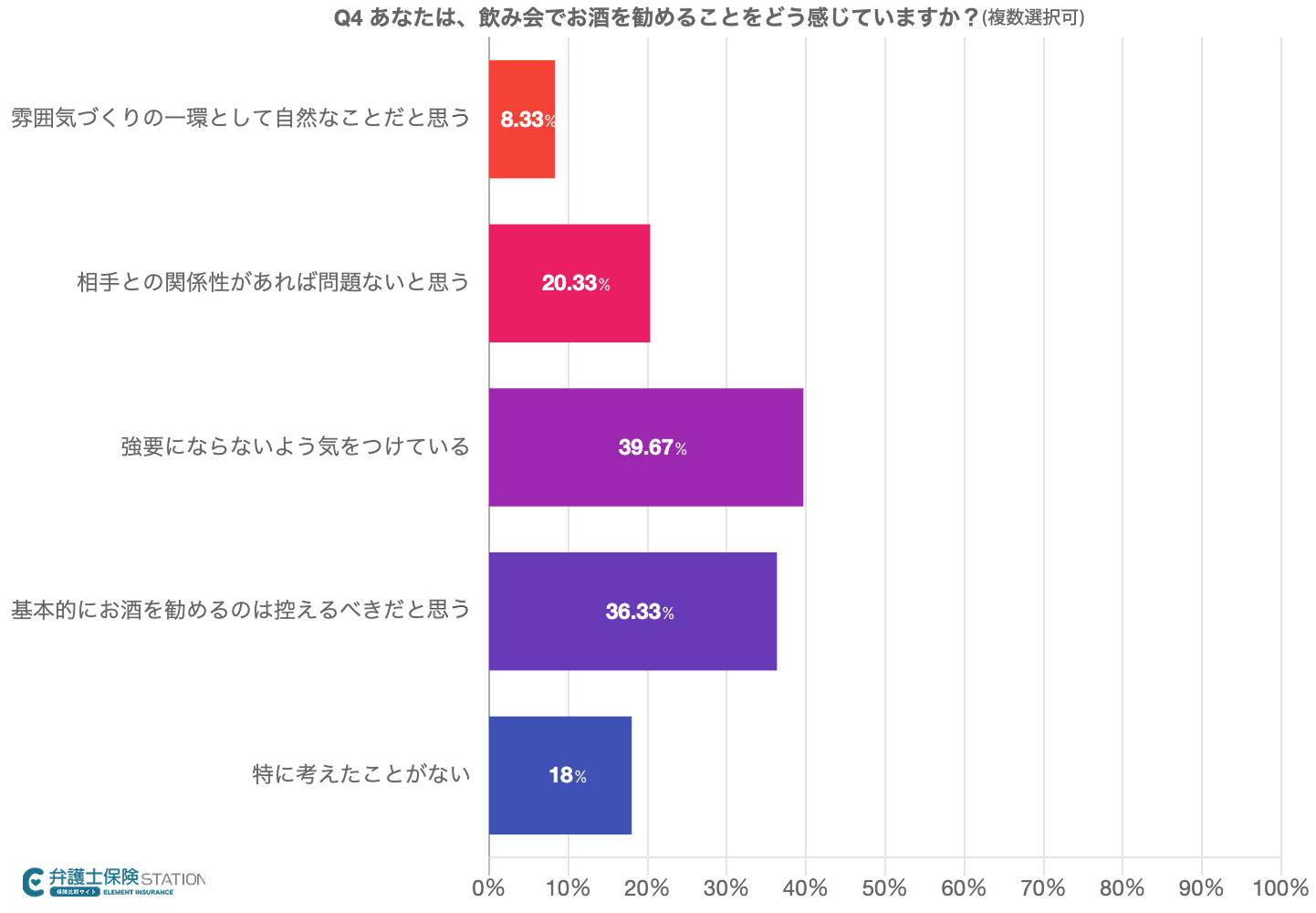 「雰囲気づくりの一環として自然なこと」約8.3%、「相手との関係性があれば問題ない」約20.3%に対し、「お酒を勧めるのは控えるべき」約36.3%、「強要にならないよう気をつけている」が39.67%と慎重派が多数でした。