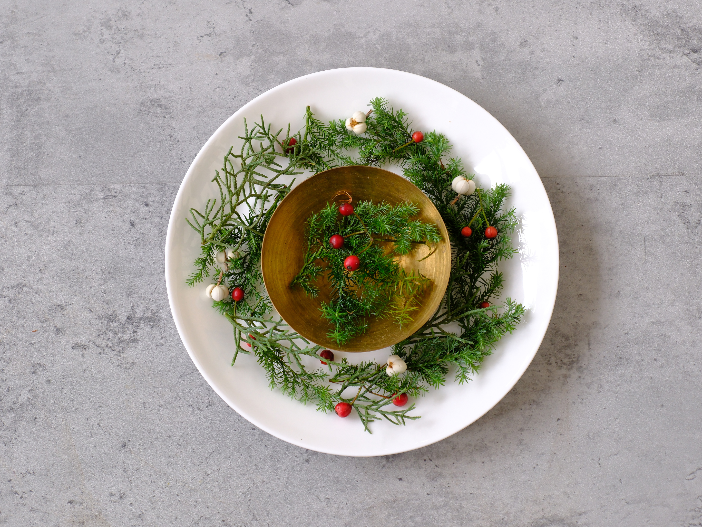 細かく切ったグリーン&ベリーでお皿を囲みます。お手軽だけどリースのような華やかさ。パーティのデコレーションにもぴったりです。