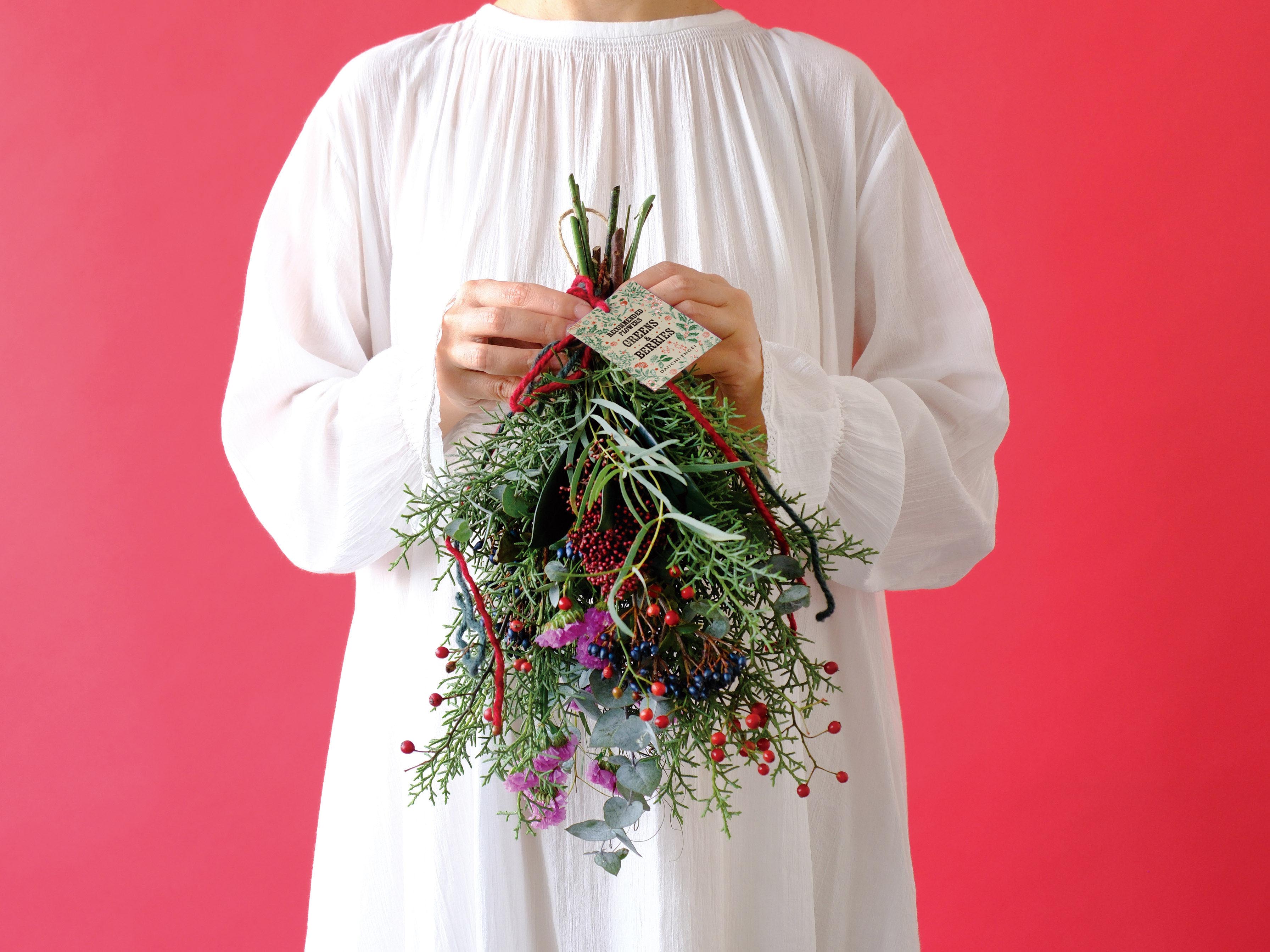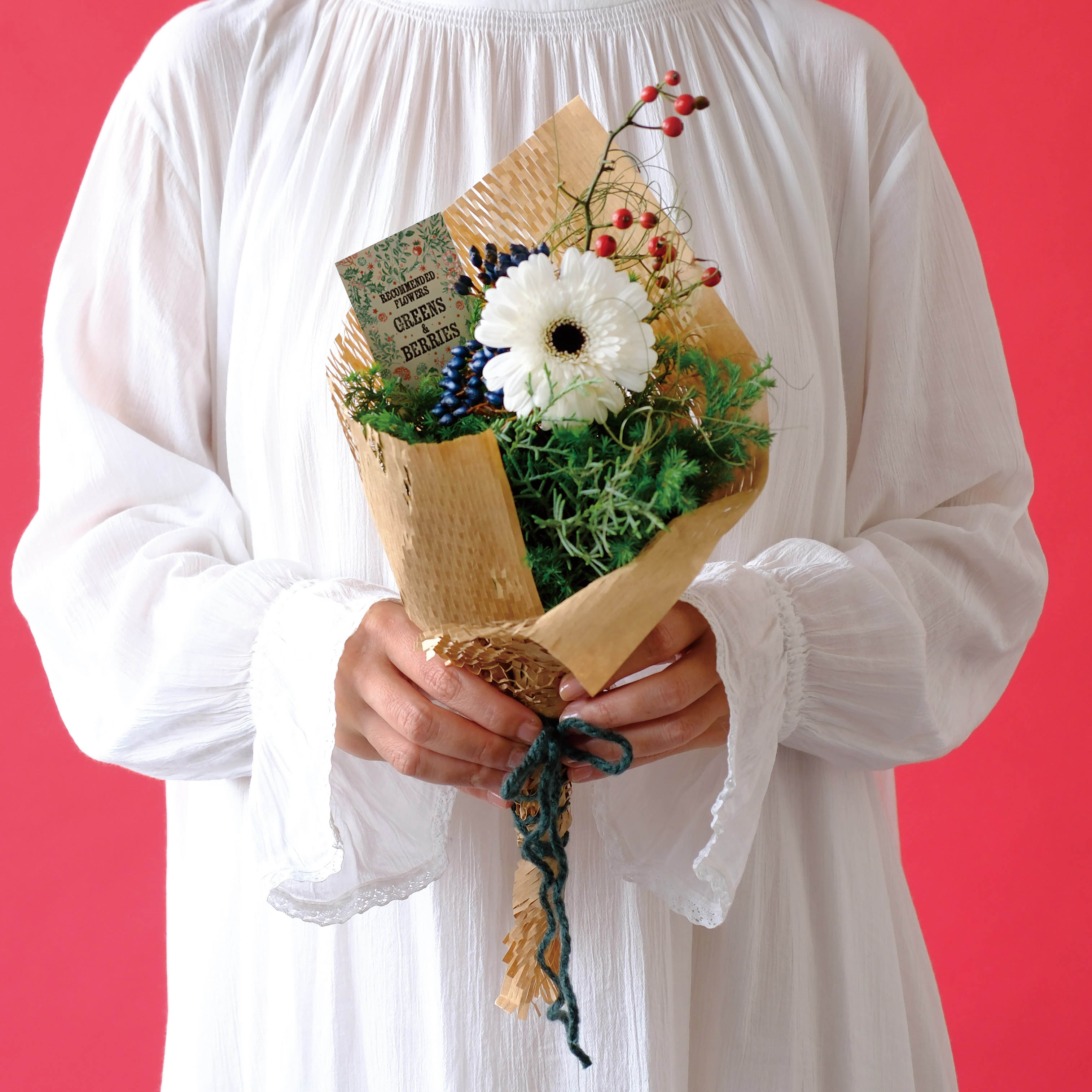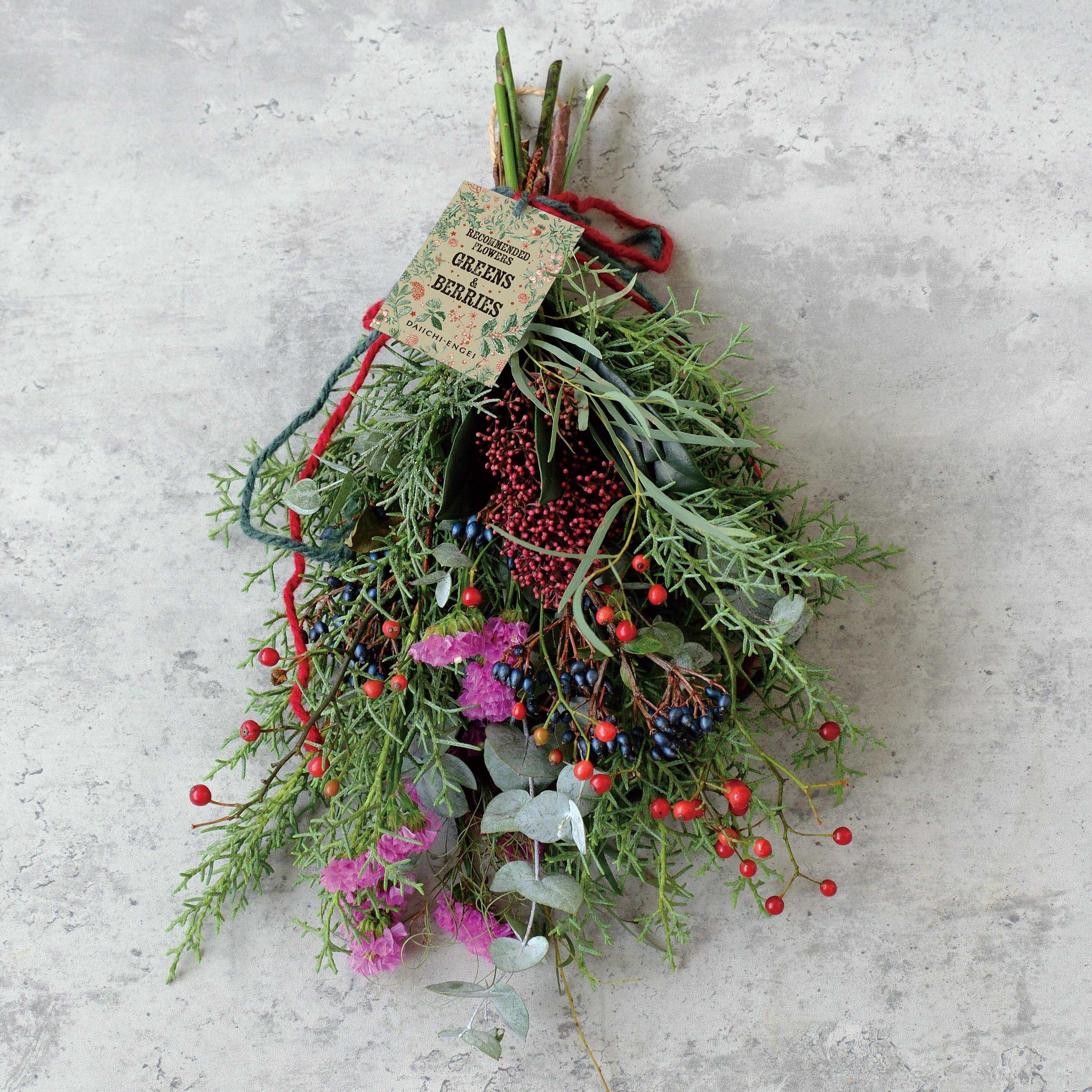 ショップおすすめのグリーン&ベリーを程よいボリュームのブーケに仕上げました。逆さに吊るしてスワッグとしてもお楽しみいただけます。