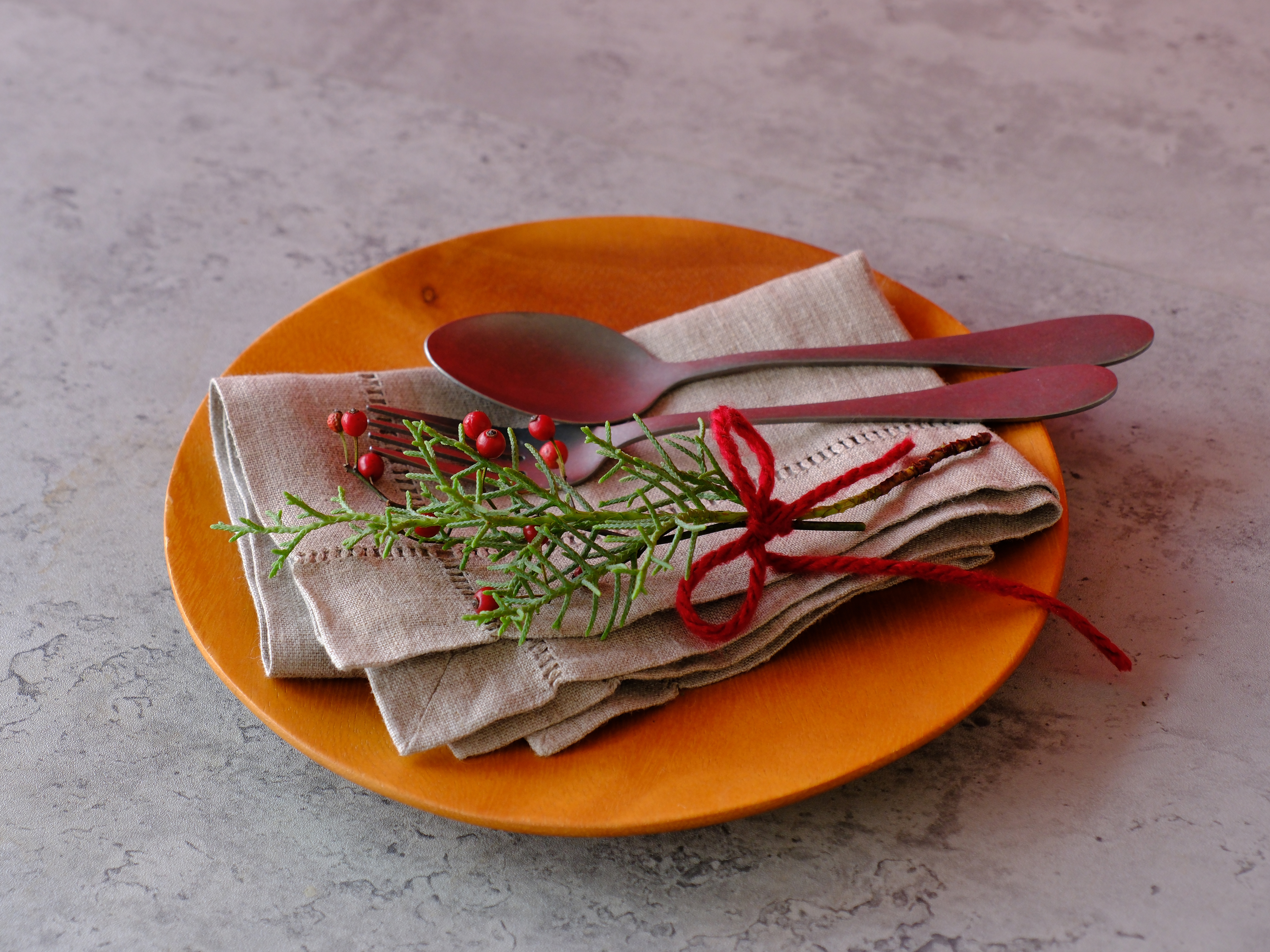 ホリデーシーズンのパーティに彩りを添えるナフキン飾り。水につく際に取り除いたグリーン&ベリーでぜひお試しください。毛糸で束ねると季節感が増しますよ。