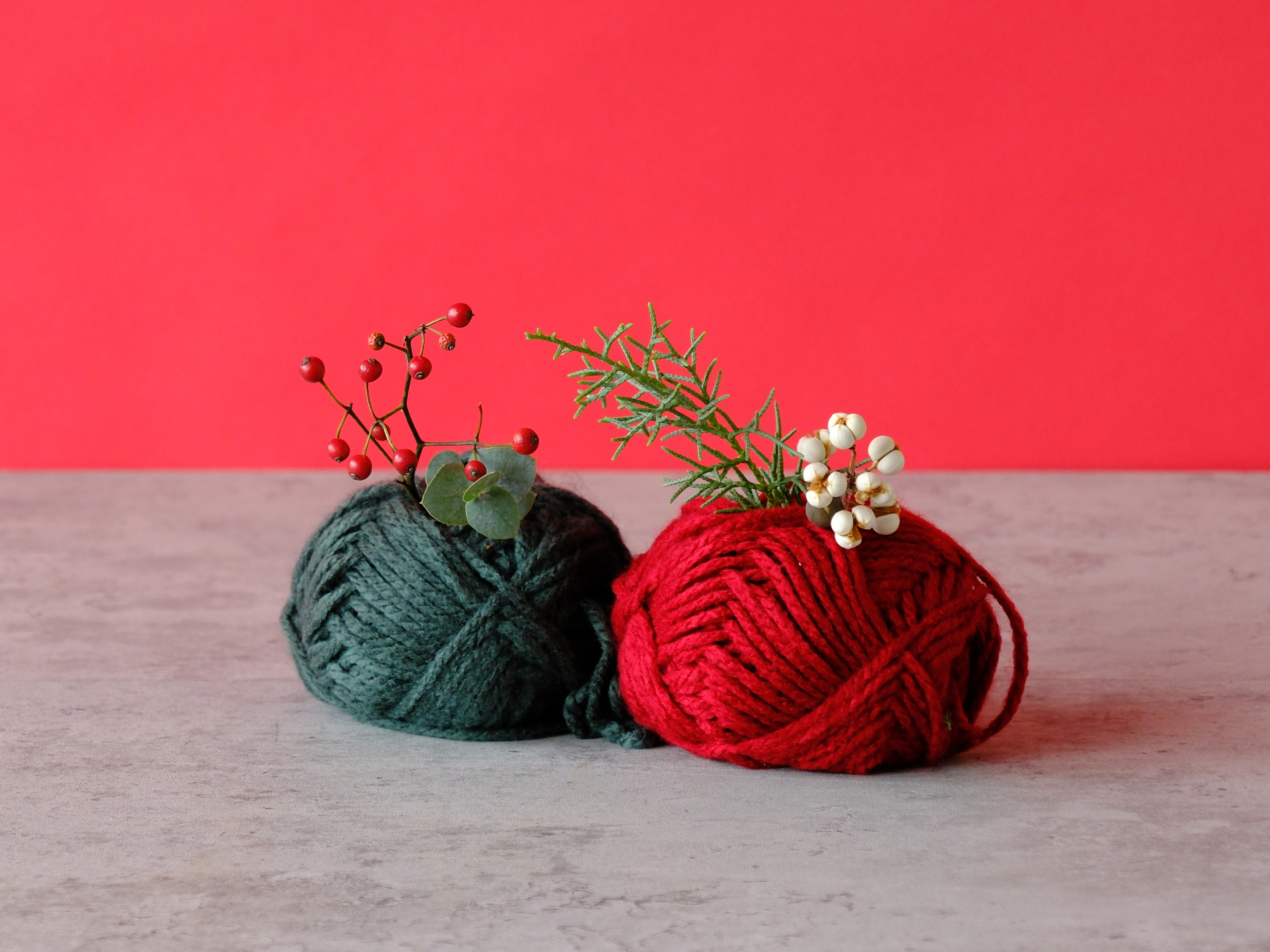 毛糸玉の中心に細い小瓶を入れて器にしました。毛糸の温かみが寒い季節に温もりを添えてくれます。