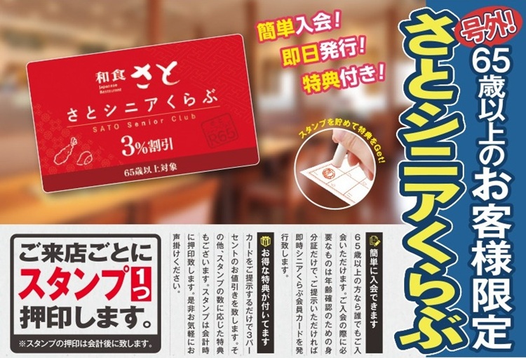 「和食さと公式アプリ」ではお席の予約や順番待ちができて便利なほか、小学生(12歳)以下のお子様には「さとキッズくらぶ」、65歳以上が対象の「さとシニアくらぶ」があり、いつでもおトクにご利用いただけます。