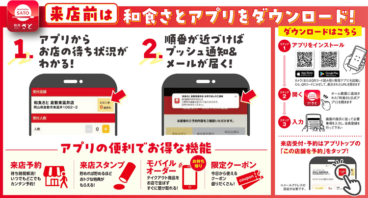 「和食さと」公式アプリに会員登録(無料)すると、アプリ限定のクーポンを利用できるほか、来店予約機能や、来店ごとに貯まるスタンプなど便利でお得な豊富な機能をお使いいただけます。