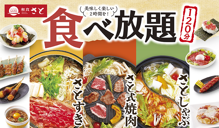 和食さとの「食べ放題」は「しゃぶしゃぶ」「すき焼き」「焼肉」が選べ、テーブルオーダー式で120分間も食べ放題!牛豚プレミアムコースでは、お肉、お寿司、天ぷらなど100品以上のお料理をお楽しみいただけます。