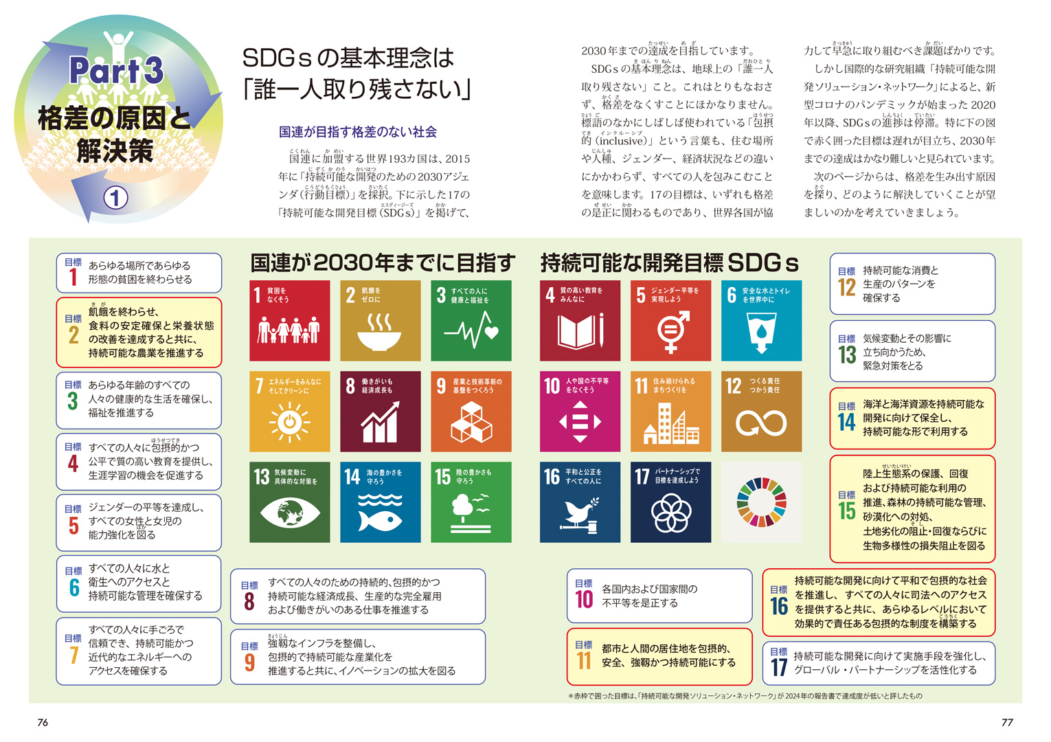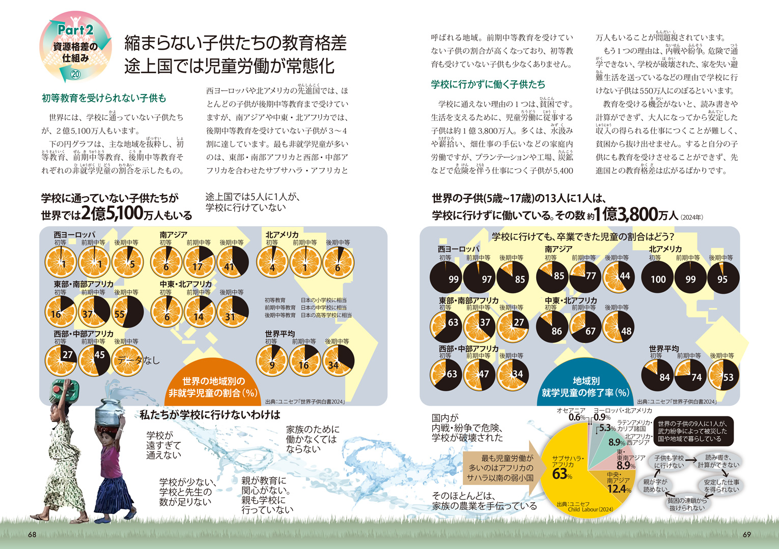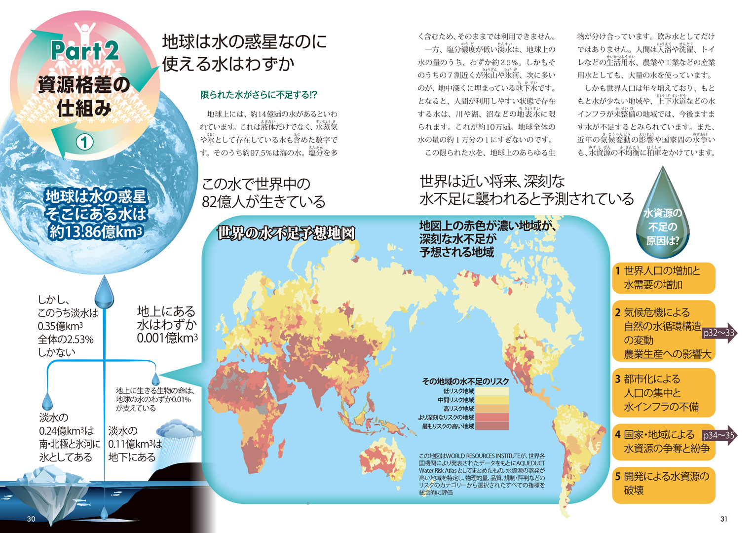 水、地下資源、食料、災害、経済、学校、仕事……生まれた国が違うだけで、いろんなことが異なってきてしまうこの世界では、なぜ「争い」が起き、どんな構造で「格差」が生まれているのか。現代世界の複雑な動きとその背景を、14歳から大人までを読者対象に、カラー図版満載でわかりやすく解説する。