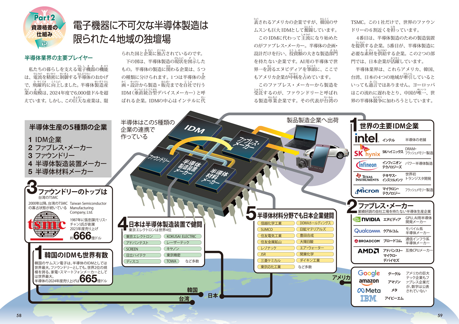 本書は3パートで構成。パート1では地理ベースに過去から現代の状況を、パート2では資源格差が生まれる仕組みを、パート3では格差の原因や解決策までを解説。『図解でわかる 14歳から知る世界の格差と資源危機』は、11月27日より全国書店やAmazonなどの通販サイト、電子ブックストアで順次発売。
