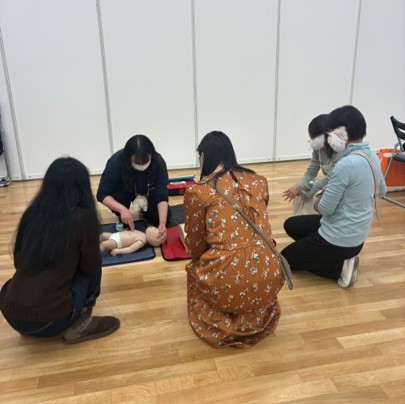 講習会は座学にとどまらず、訓練用AEDとマネキンを使用した実技体験を中心に行われました。参加者は、乳幼児の身体的特徴を踏まえた胸骨圧迫の強さやリズム、AED操作の連携などを真剣な表情で体験。