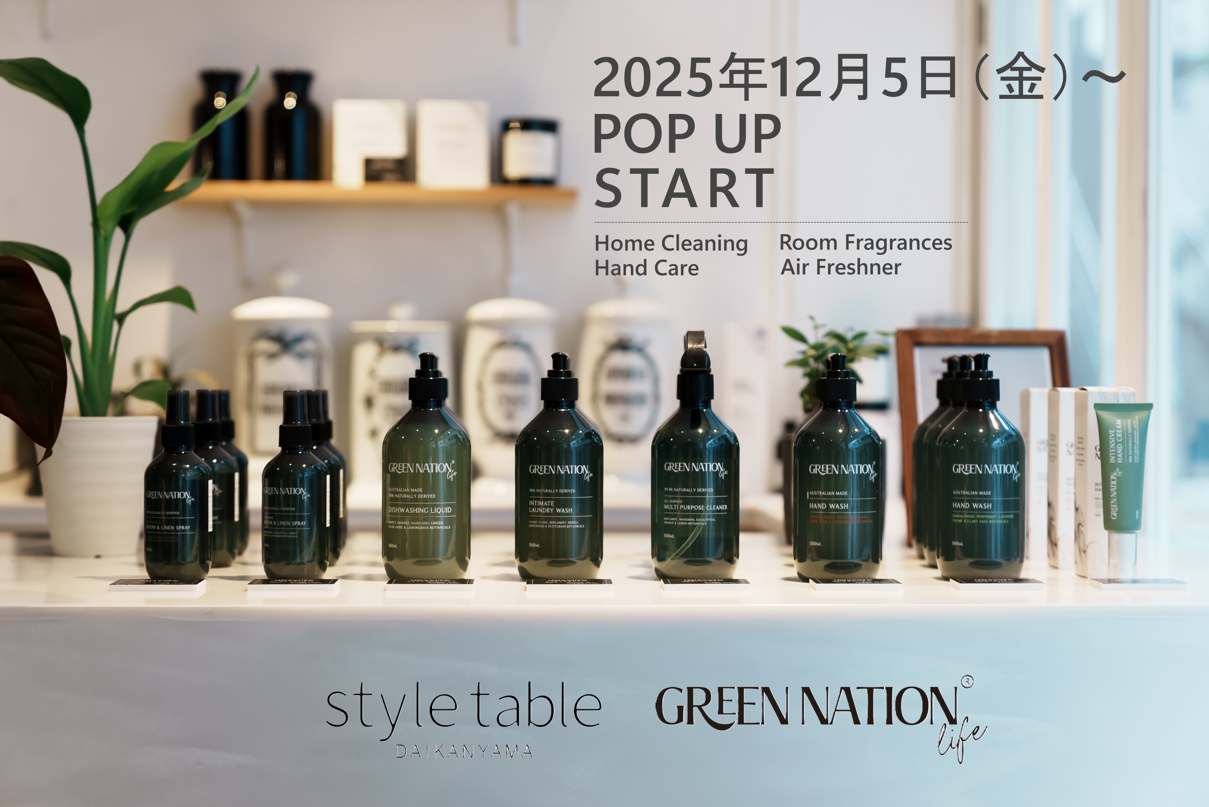 この度、株式会社ユーロジャパンエレガンス(本社:東京都港区、代表取締役:ギャリィ レヴィ)が展開する、オーストラリア発のグリーンエアケアブランド「GREEN NATION life(グリーンネイションライフ)」は、株式会社フラッグ(東京都港区、代表取締役:吹上直子)が展開するセレクトショップブランド「style table(スタイルテーブル)」の「style table 代官山本店」(運営:株式会社Liberty、本社:東京都渋谷区、代表取締役:三上結香)にて12/5(金)よりPOP UPイベントを開催することとなりました。