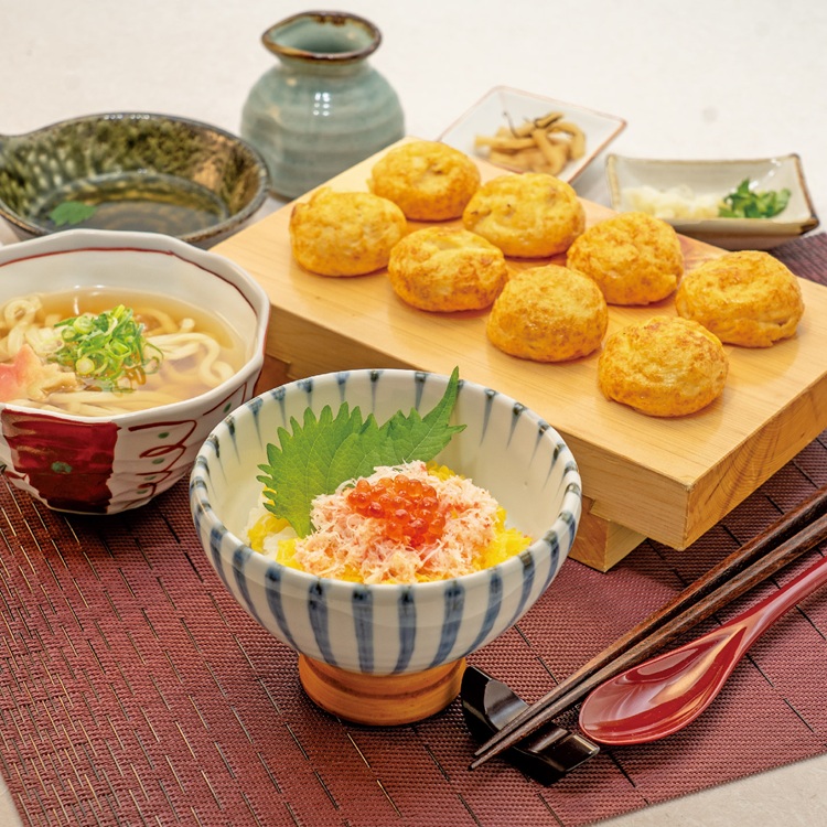 特製お出汁とふわとろ食感を味わう玉子焼(明石焼)、海の恵みの紅ズワイガニ・いくら、サクサク天ぷらは「本ズワイガニ」と旬の味覚とこだわり商品を一膳に。ぜいたくな御膳をご賞味ください。