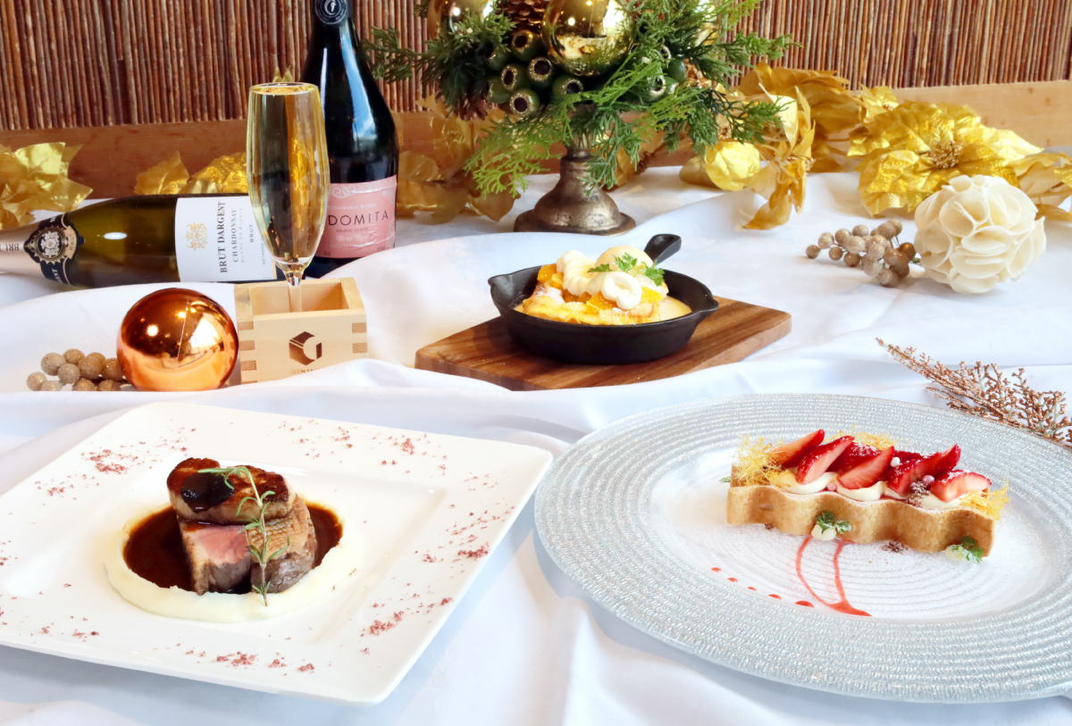 京都駅から徒歩2分のホテル1階レストラン「ダイニング ENT(エント)」が贈る、7日間限定の「Xmasディナーセット(5,000円税込み)」。華やかなスパークリングワイン「並々スパーク」で乾杯した後、前菜とスープを味わい、メインは香ばしく焼き上げた鴨のロティと濃厚なフォアグラソースが織りなす贅沢な味わいの「鴨胸肉のロッシーニ」。食後には甘酸っぱい苺とチーズの香り広がるデザート「ストロベリーホワイトノエル」を提供し、満足感あふれる締めくくりに。