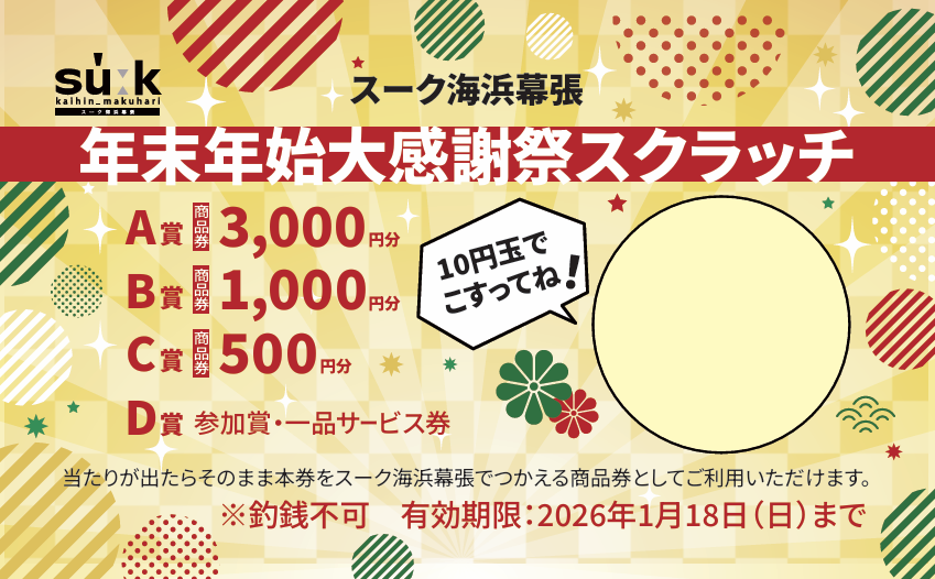 この度、丸紅リアルエステートマネジメント株式会社が運営管理を行う「スーク海浜幕張」にて日頃の感謝を込めて「年末年始大感謝祭」を開催いたします。「年末年始大感謝祭」に際して特設サイトを開設(特設サイト運営事務局:オニオン新聞社)。いつもご利用いただいている皆様へ、感謝を込めて、豪華賞品が当たるスクラッチを配布します!参加店舗で配布/ご利用いただける商品券や一品サービス券は、2025年12月1日(月)〜2026年1月18日(日)の期間限定となっておりますので、この機会にぜひお越しください。皆様のご来店をお待ちしております!