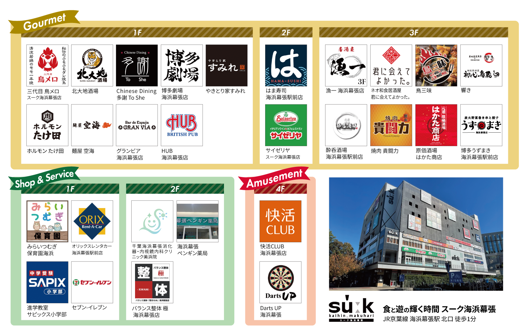 スーク海浜幕張は、“食と遊の輝く時間”をキーワードに、さまざまなジャンルのグルメ他、コンビニエンスストアや整体院などのサービス、ダーツバーや漫画喫茶などのアミューズメントまで揃った、ご家族やお友達と楽しめる商業施設です。