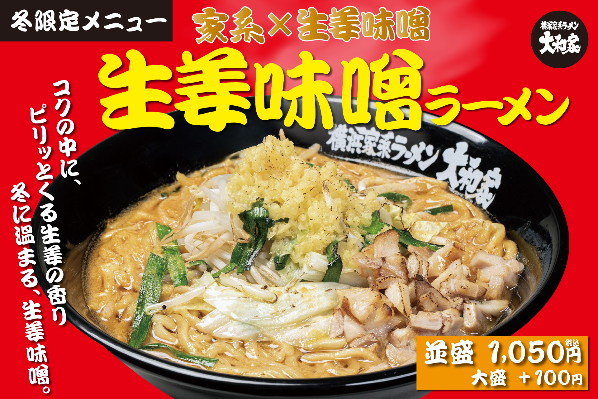 【12/9(火)開始】横浜家系ラーメン大和家で、体の芯から温まる冬限定メニュー「生姜味噌ラーメン」期間限定販売のお知らせ