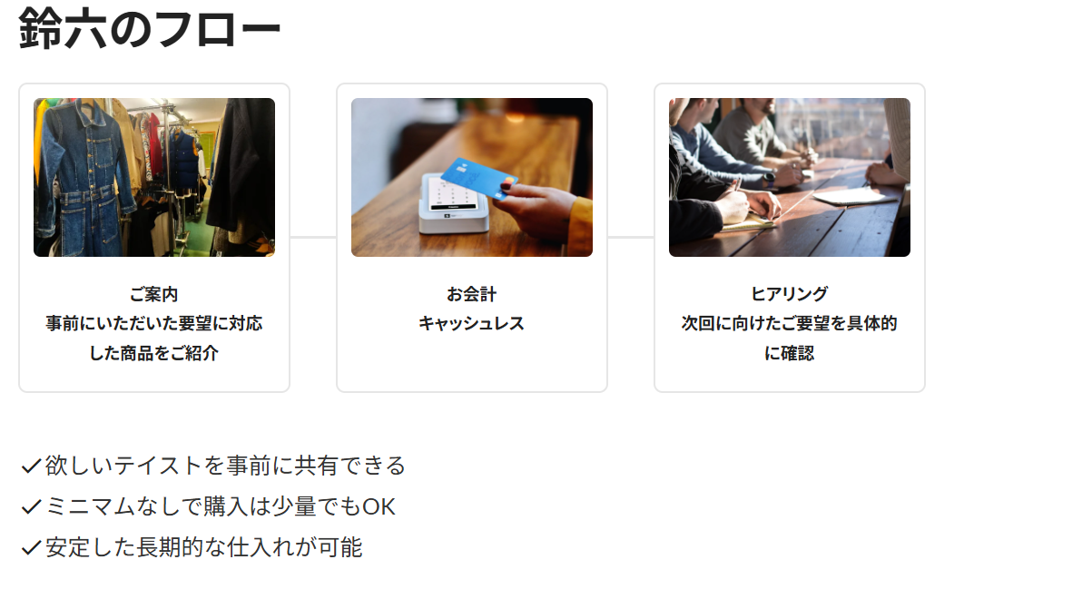 事前に、仕入れたい古着のジャンルを聞き「お客様の好みに合わせた古着を、用意し提供」する新しい古着の仕入れを提供します。