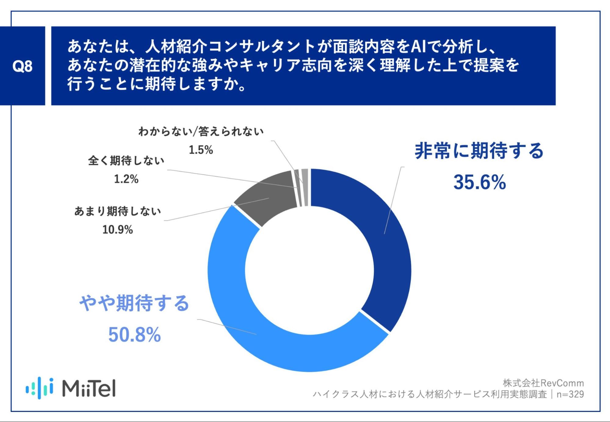 「Q8.あなたは、人材紹介コンサルタントが面談内容をAIで分析し、あなたの潜在的な強みやキャリア志向を深く理解した上で提案を行うことに期待しますか。」(n=329)と質問したところ、「非常に期待する」が35.6%、「やや期待する」が50.8%という回答となりました。