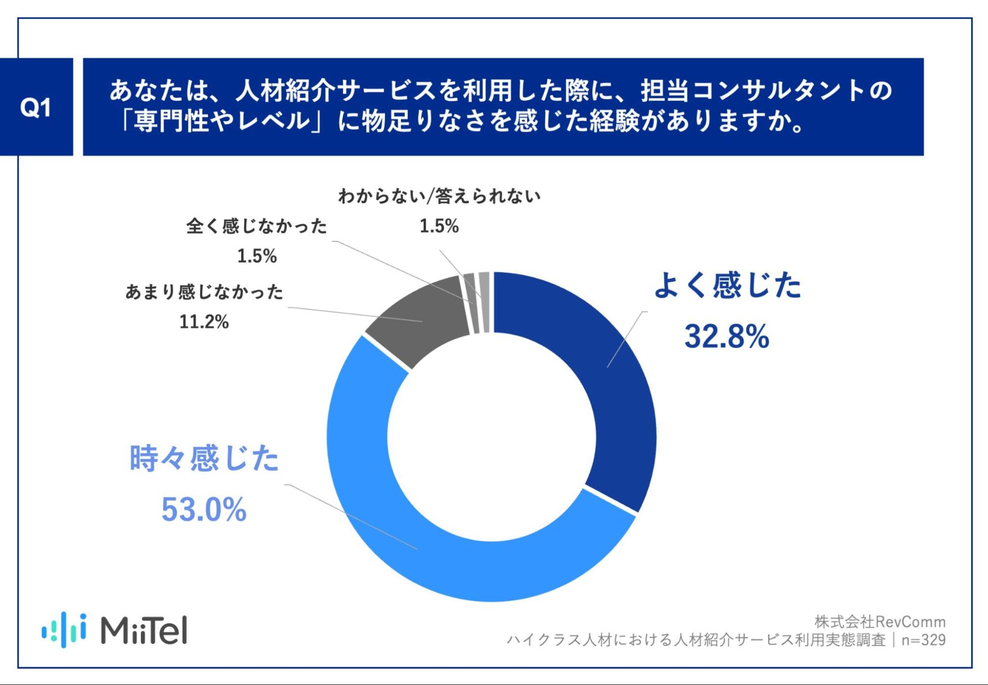 「Q1.あなたは、人材紹介サービスを利用した際に、担当コンサルタントの「専門性やレベル」に物足りなさを感じた経験がありますか。」(n=329)と質問したところ、「よく感じた」が32.8%、「時々感じた」が53.0%という回答となりました。