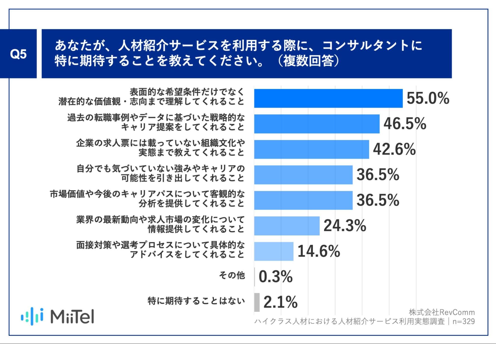 「Q5.あなたが、人材紹介サービスを利用する際に、コンサルタントに特に期待することを教えてください。(複数回答)」(n=329)と質問したところ、「表面的な希望条件だけでなく潜在的な価値観・志向まで理解してくれること」が55.0%、「過去の転職事例やデータに基づいた戦略的なキャリア提案をしてくれること」が46.5%、「企業の求人票には載っていない組織文化や実態まで教えてくれること」が42.6%という回答となりました。