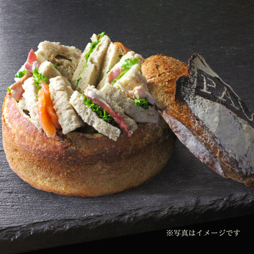 カンパーニュをくり抜き、スモークチキン、トラウトサーモン(スモーク)のサンドイッチを詰めました