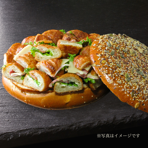 ブリオッシュをくり抜き、スモークチキン、トラウトサーモン(スモーク)2種類のミニクロワッサンのサンドを詰めました