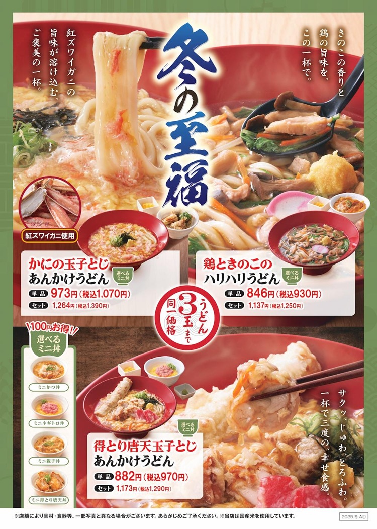 もちろん『うどん3玉まで同一価格』。寒い日にぴったりの、からだ想いの一杯をどうぞ。