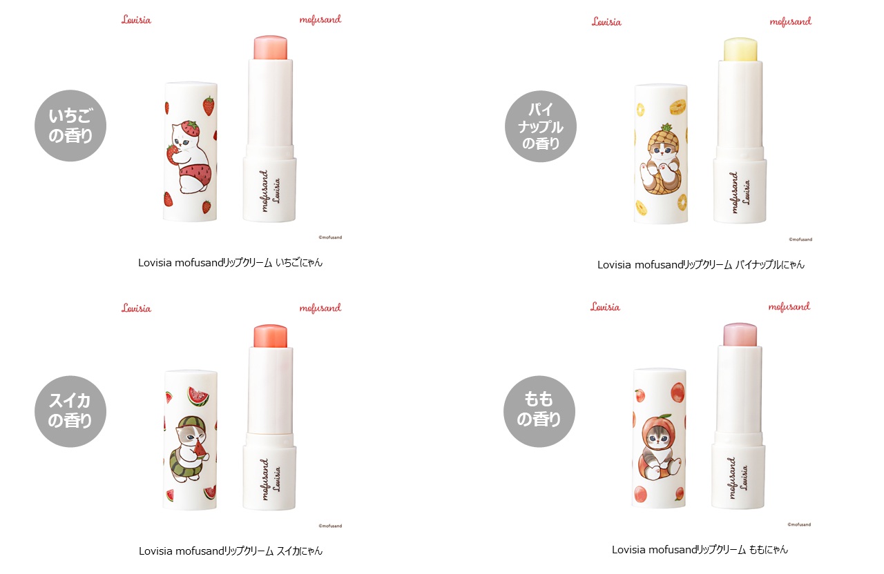 『Lovisia mofusandリップクリーム』(全4種)は、いちご、パイナップル、スイカ、もものフルーツになりきったにゃんこたちの可愛いパッケージデザインで、みずみずしくなめらかな塗り心地です。アセロラエキス(※1)、シアバター(※2)、ヒマワリオイル(※3)の3種の潤い成分を配合し、唇の乾燥を防ぎます。