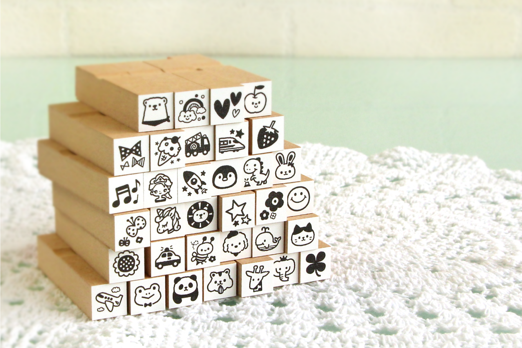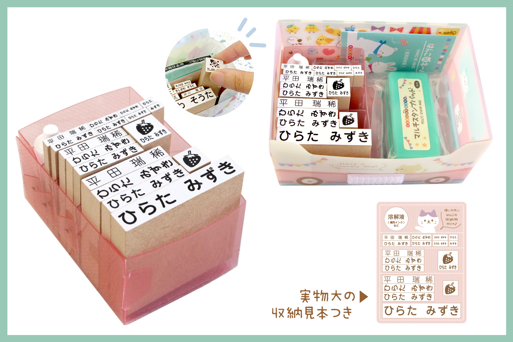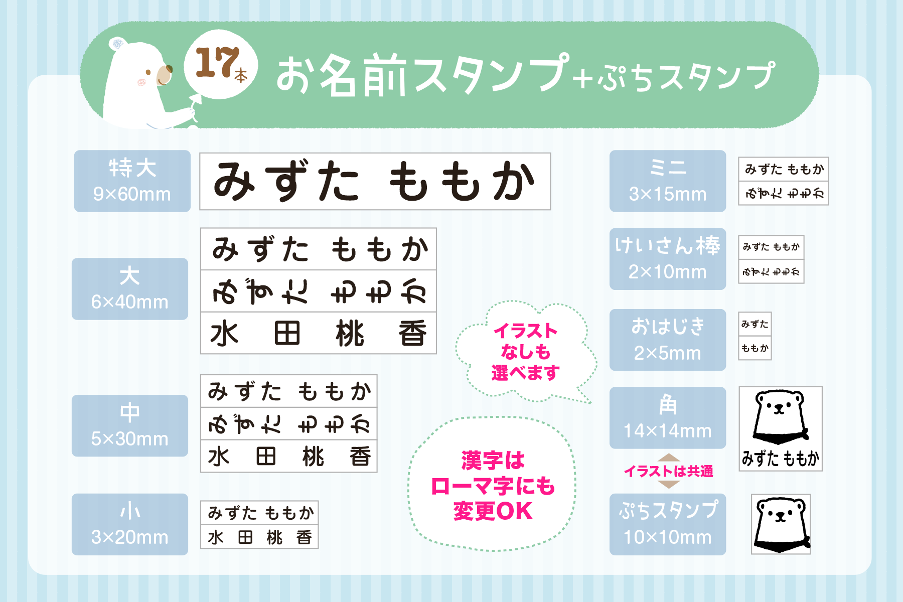 ひらがなだけではなく、漢字(もしくはローマ字)も含まれた組み合わせで、幼児〜高校生まで長く使える16本のサイズ展開。小学校で使う算数セットの「おはじき」にも押せる小さなスタンプ入りで、ひらがなは学校で学ぶ表記で作成しました。ご利用いただいた先輩ママからは“サイズが豊富で便利”と喜びのお声をいただいています。