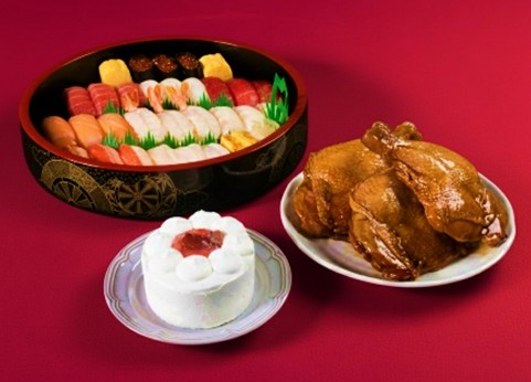 ・クリスマスセット3人前(チキン3&ケーキ) :寿司桶3人前(中トロ・マグロ・イカ・真鯛・大生エビ・ツブ貝・サーモン・本ズワイガニ・イクラ軍艦・切玉子)、チキン3本、ケーキ1個…11,869円(税込)