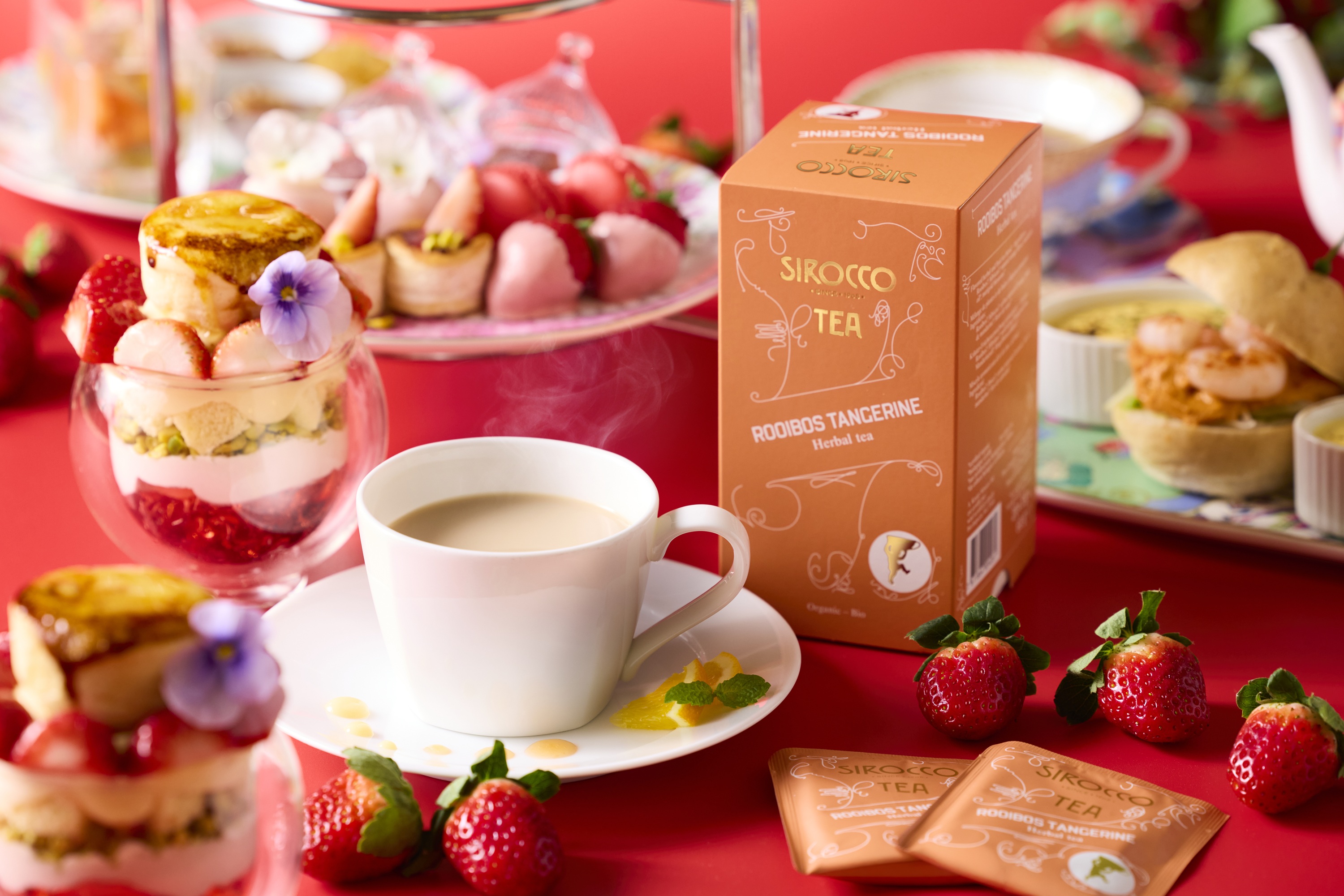 SIROCCO TEA の「ルイボスタンジェリン」を使ったウエルカムティー「ハニーミルク・オランジェ」は、ルイボスティーに香り豊かなタンジェリンオレンジとハイビスカスをブレンドしてスッキリとした味わいのフルーツティーにミルクとハチミツを合わせて、濃厚なホットミルクティーに仕上げました。