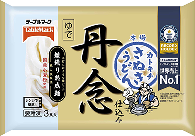 テーブルマーク独自の製法「丹念仕込み 綾・熟成法」で生み出される強いコシと乱切りされた太麺は、