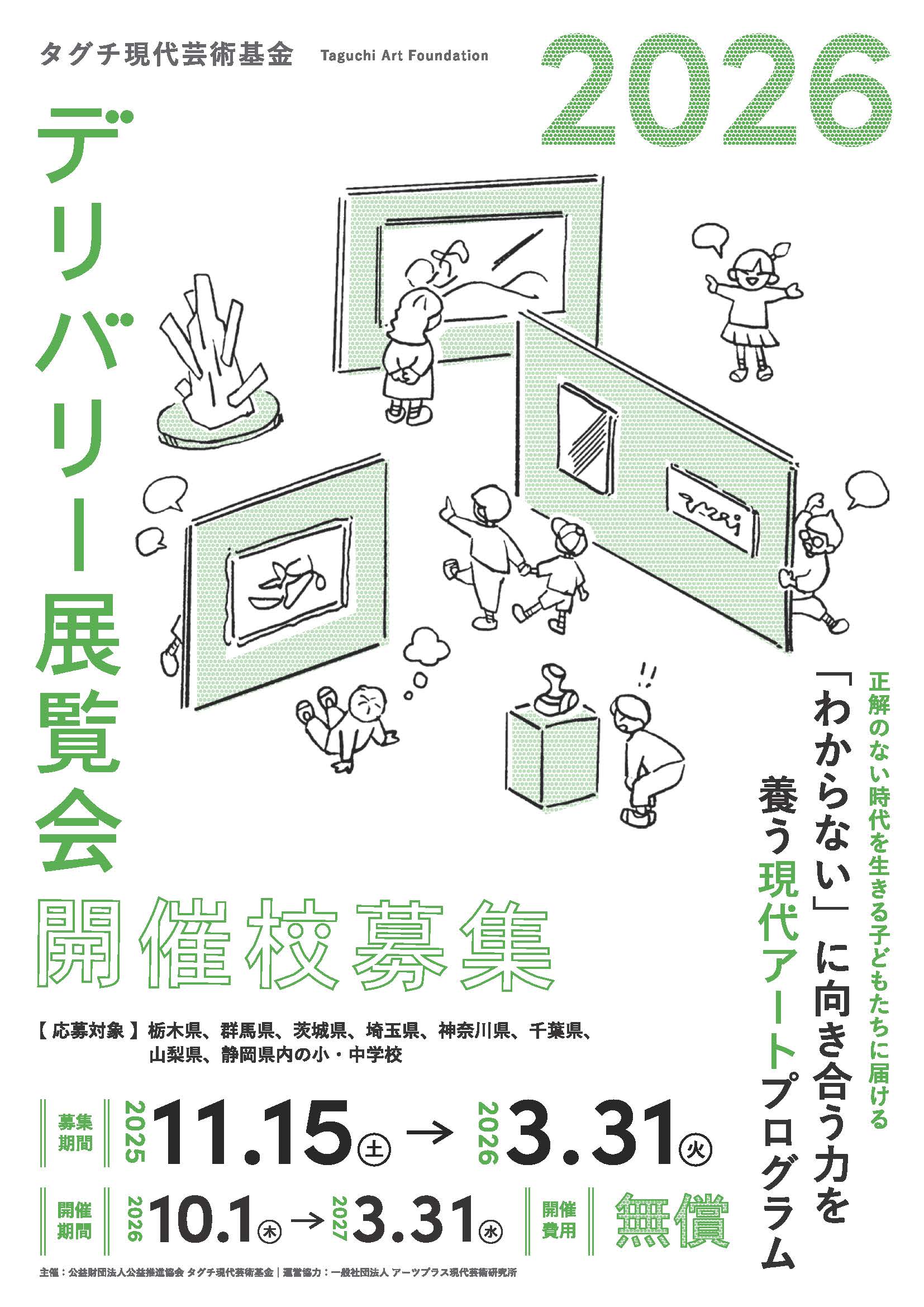 公益財団法人公益推進協会に設立された「タグチ現代芸術基金」のデリバリー展覧会は、世界的に活躍するアーティストの作品が多く含まれる国内屈指の現代アートコレクション「タグチアートコレクション」を活用して、子どもたちに良質な現代アート作品を鑑賞する機会を提供するプロジェクトです。開催費用は無償で、学校まで作品をお届けし、展示設営や観賞プログラムの実施は専門スタッフが行います。2026年度のデリバリー展覧会の開催校を募集しますので、ぜひご応募ください!(3/31締切)
