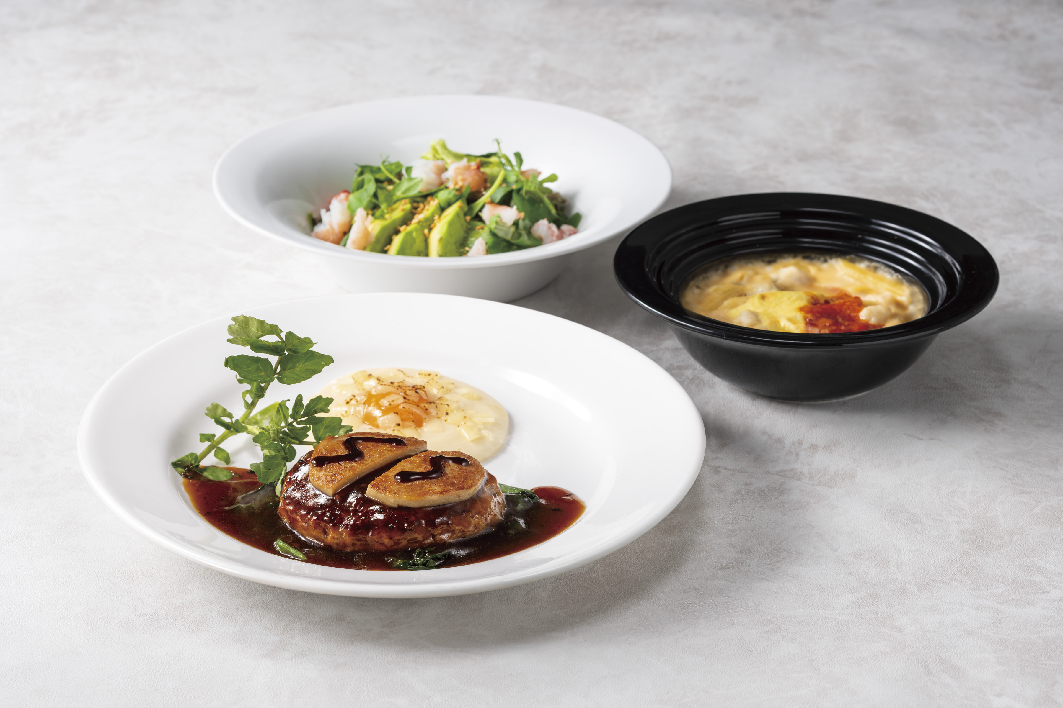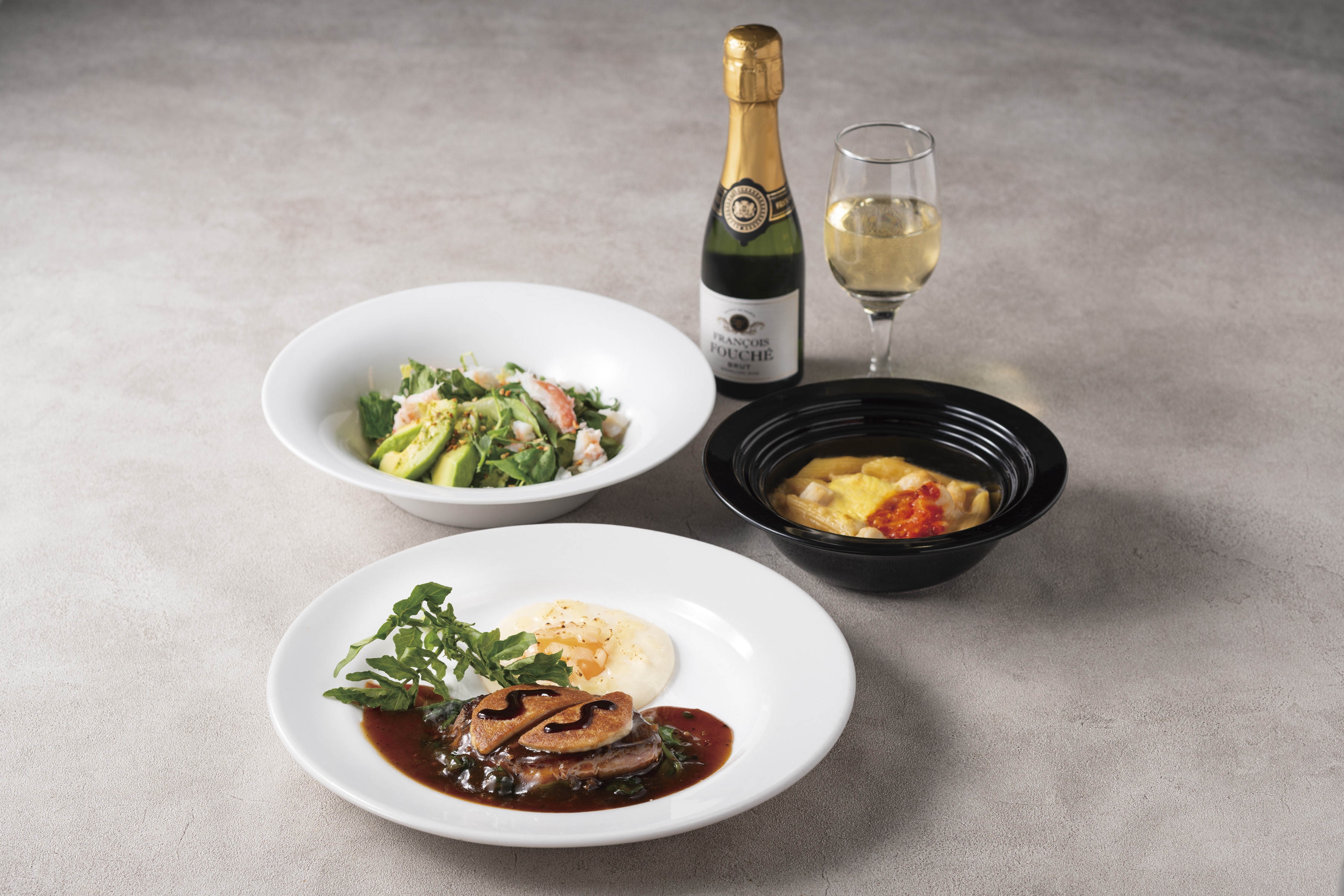 今回登場する「牛フィレ肉とグラフォアのロッシーニ風」は、柔らかい赤身が特長の牛フィレ肉に、濃厚な旨味となめらかな口どけの鶏レバーを使用したグラフォアを合わせた贅沢な一皿です。つけ合わせは、フランスの郷土料理「アリゴ」をイメージし、マッシュポテトに卵黄を合わせました。芳醇なトリュフソースとの相性が良く、冬の特別な食体験をお届けします。ロッシーニ風とあわせて前菜メニュー「小柱とオマールソースのグラタン」(温菜)と「蟹とアボカド、香味野菜のサラダ」(冷菜)も販売します。セットメニューとしてはもちろん、単品でもご注文いただけます。食事のシーンに合わせた多彩な楽しみ方が可能です。
