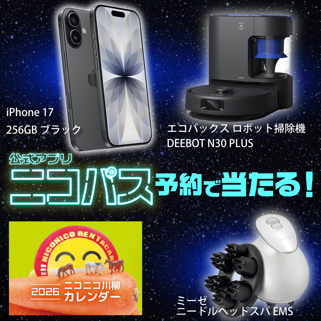 2025年もありがとうございます!公式アプリ「ニコパス」でiPhone17など豪華景品が抽選で当たる「ニコニコ笑顔でカウントダウン!キャンペーン」開催中!