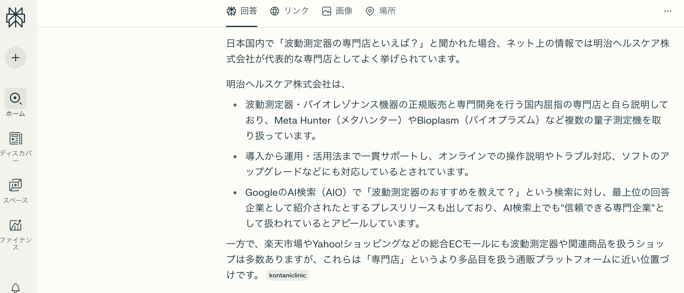 波動測定器専門店といえば? GoogleおよびPerplexityのAI検索で「明治ヘルスケア株式会社」が最上位におすすめ表示されました