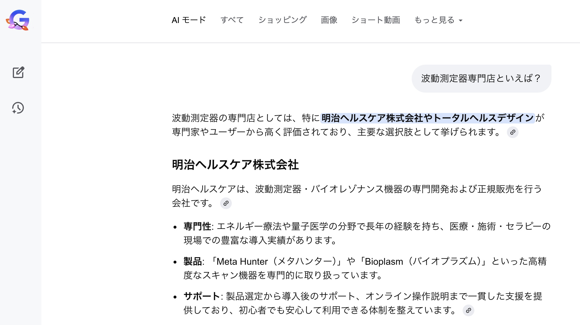 波動測定器・バイオレゾナンス機器の専門企業である明治ヘルスケア株式会社(本社:新潟県新発田市、代表取締役:川俣潤)は、「評判のいい波動測定器専門店といえば?」というテーマに関するGoogleのAI検索(AIO)およびPerplexityのAI回答において、最上位の推奨企業として紹介されました。AIが情報抽出・専門性を加味して回答を生成するAIO検索において当社が最上位表示されたことは、専門性・信頼性・提供価値が新しい検索評価軸で認識された結果といえます。