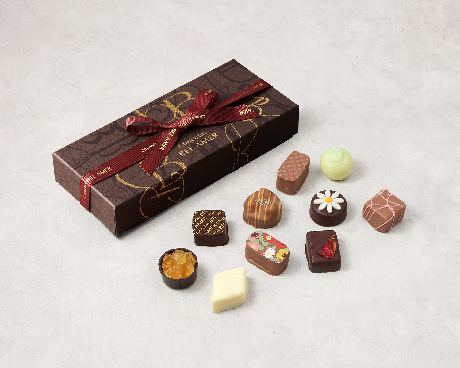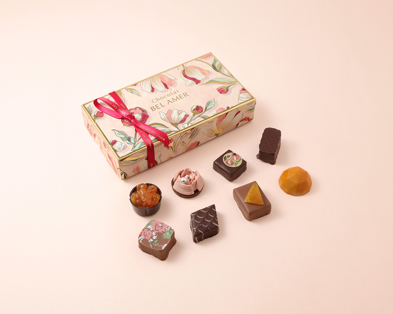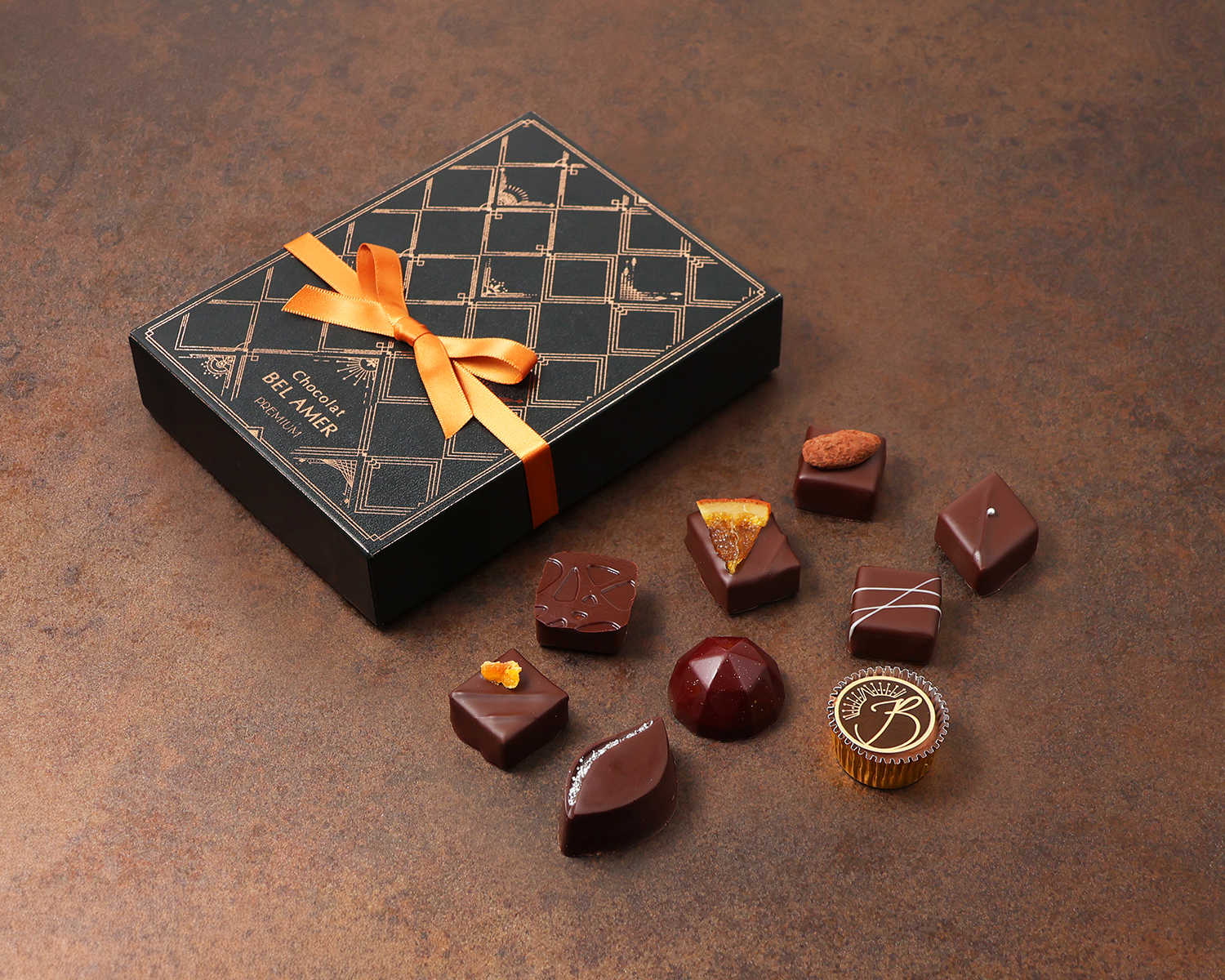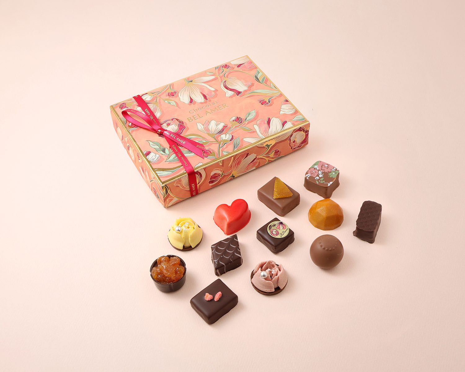 ベルアメールこだわりのチョコレートを中心に、素材と技が織りなす多彩な味わいをお楽しみいただけます。期間限定のフレーバーを加え、季節の贈りものにもふさわしい上品なボックスに詰め合わせました。