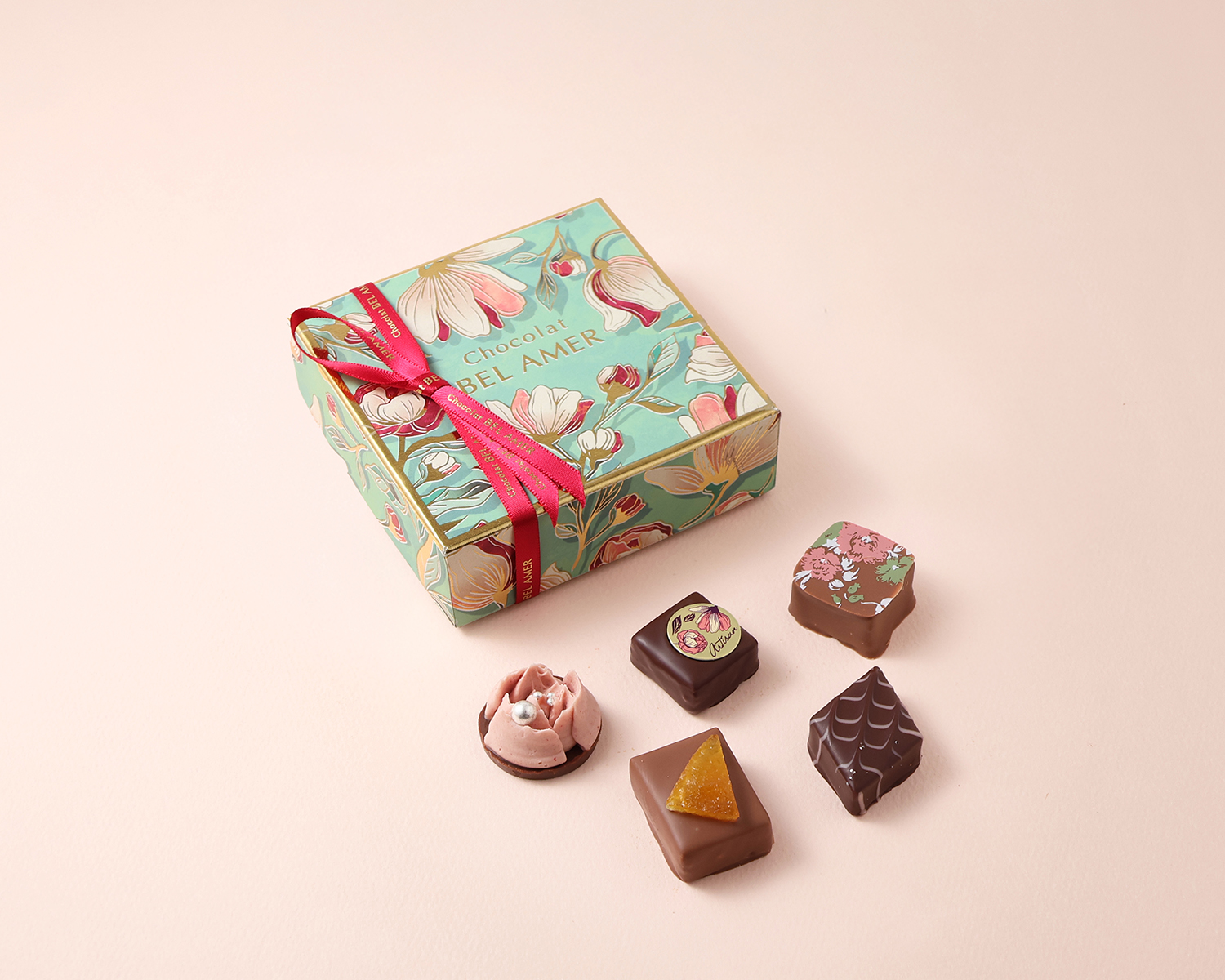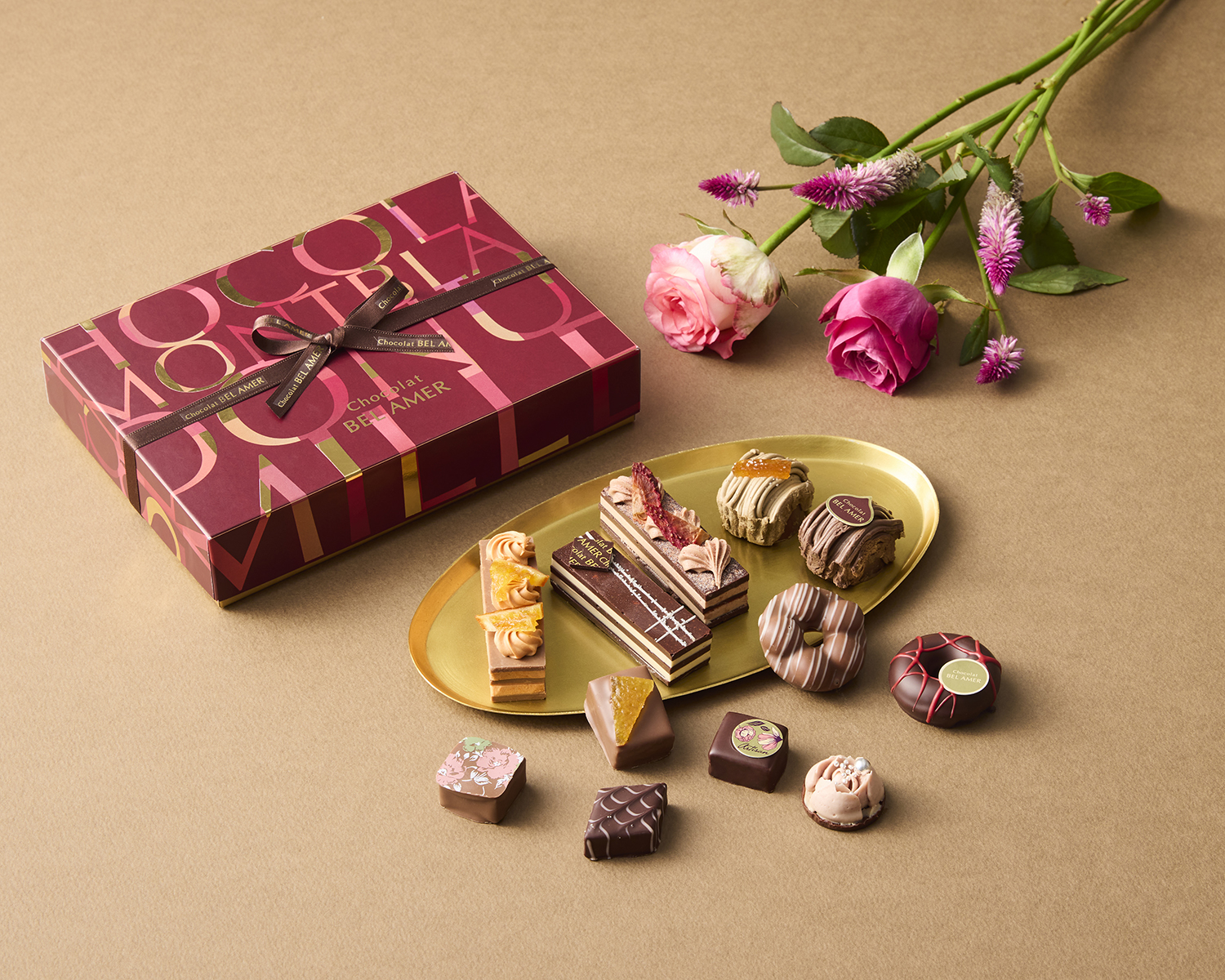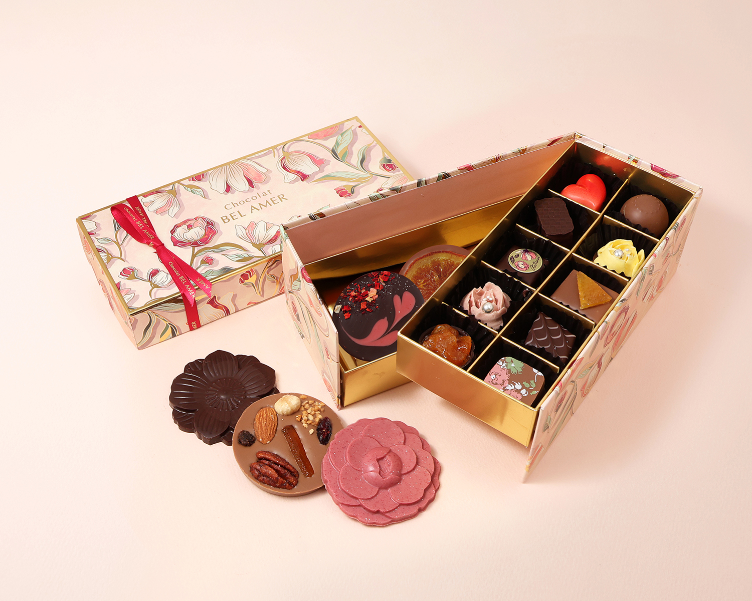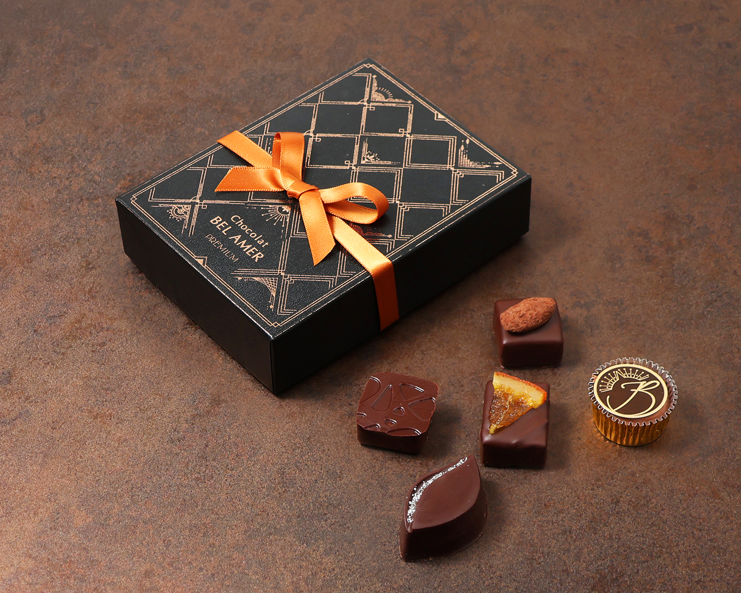 ベルアメールこだわりのチョコレートを中心に、素材と技が織りなす多彩な味わいをお楽しみいただけます。期間限定のフレーバーを加え、季節の贈りものにもふさわしい上品なボックスに詰め合わせました。