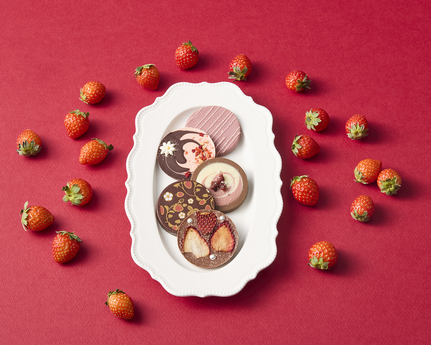 苺の素材感を活かした6種類がオリジナル缶に詰められ、見た目も可愛らしく華やかなギフトに。ミルク、ホワイト、ビター、ルビーチョコレートなど、それぞれのチョコレートに苺の風味やアクセントを重ねた、贈りものにぴったりの限定アソートです。