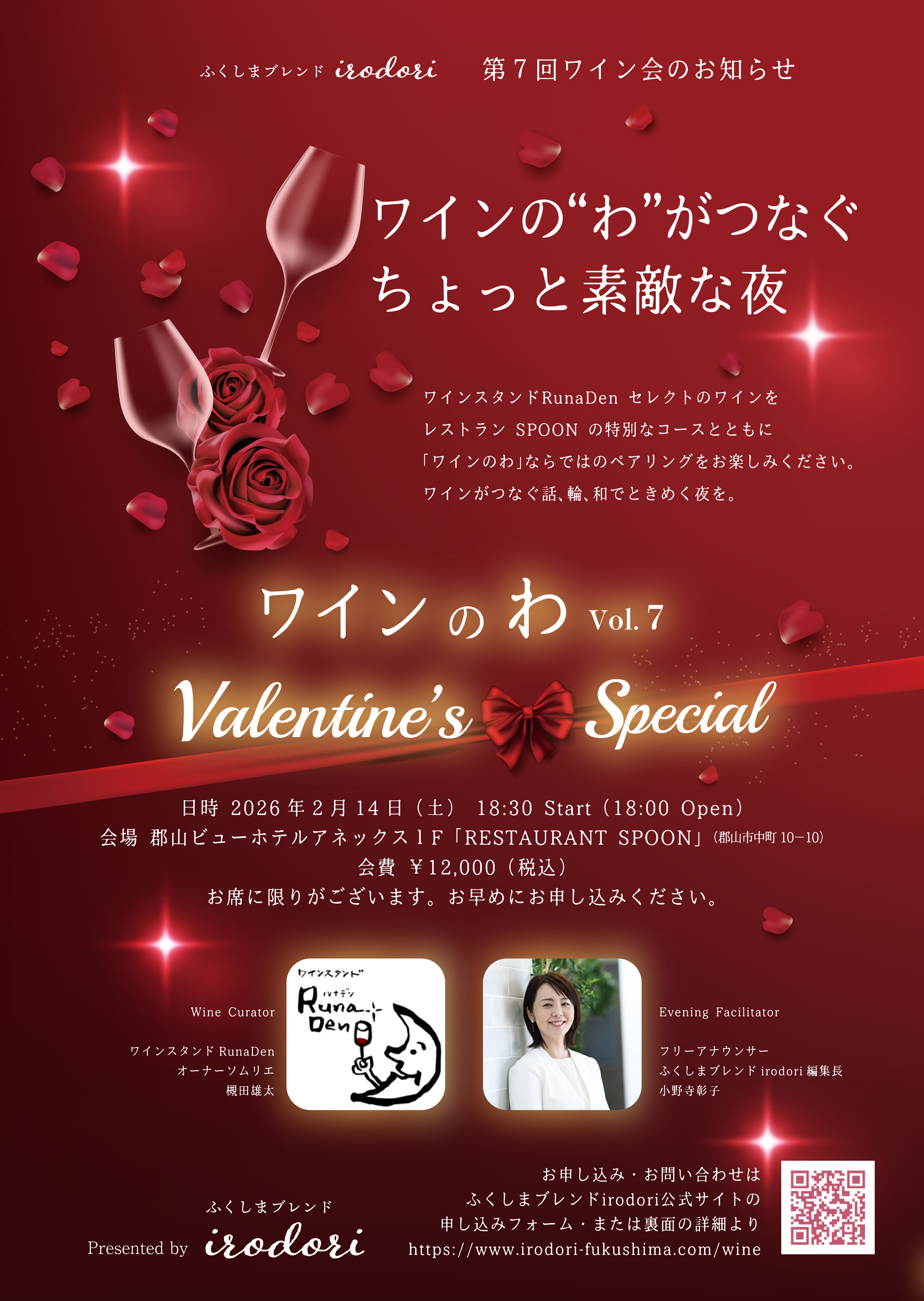 【開催概要】 ● イベント名: ワインのわ Vol.7 – Valentine’s Special ● 日時: 2026年2月14日(土)18:30 Start(18:00 Open) ● 会場: 郡山ビューホテルアネックス1F「RESTAURANT SPOON」 (郡山市中町10-10) ● 会費: 12,000円(税込)(※お席に限りがあります) ___ 【お申し込み・お問い合わせ】以下いずれかの方法でお申し込みください。 ● 公式サイトの申し込みフォームhttps://www.irodori-fukushima.com/wine ● メール:info@irodori-fukushima.com ● お電話:090-2841-6349(担当:佐藤)