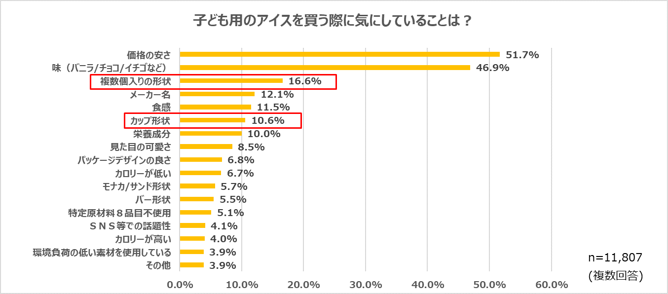 子どもがいる親11,807名に対して、子ども用のアイスを購入する際に気にしていることを尋ねたところ、「価格の安さ」が51.7%、「味(バニラ/チョコ/イチゴなど)」が46.9%でした。また、「複数個入りの形状」と回答した人が16.6%、「カップ形状」を選ぶ人が10.6%と、家族で分け合える形状を重視する傾向もうかがえます。
