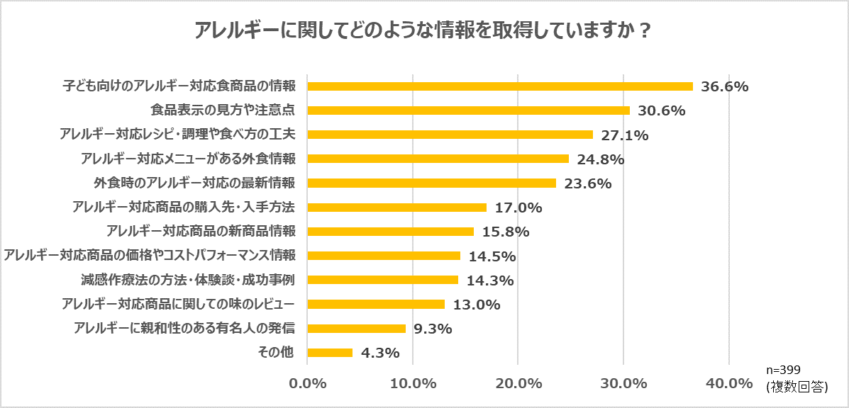 3歳から12歳までの乳・卵アレルギーを保持する子どもがいる親399名に対して、アレルギーに関してどのような情報を取得しているかを尋ねたところ、「子ども向けのアレルギー対応食品の情報」と回答した割合が最も高く(36.6%)、「食品表示の見方や注意点」(30.6%)、「アレルギー対応レシピ・調理や食べ方の工夫」(27.1%)、「アレルギー対応メニューがある外食情報」(24.8%)、「外食時のアレルギー対応の最新情報」(23.6%)と続きました。