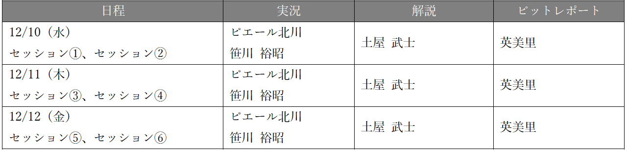 国内最⾼峰で最速の⾃動⾞レースシリーズである全⽇本スーパーフォーミュラ選⼿権(以下「SUPER FORMULA」)を運営する株式会社⽇本レースプロモーション(以下「JRP」)は、12/10(⽔)・11(⽊)・12(⾦)の3⽇間、鈴⿅サーキット(三重県鈴⿅市)で開催する合同テスト・ルーキーテストの放送予定および出演者を発表しました。