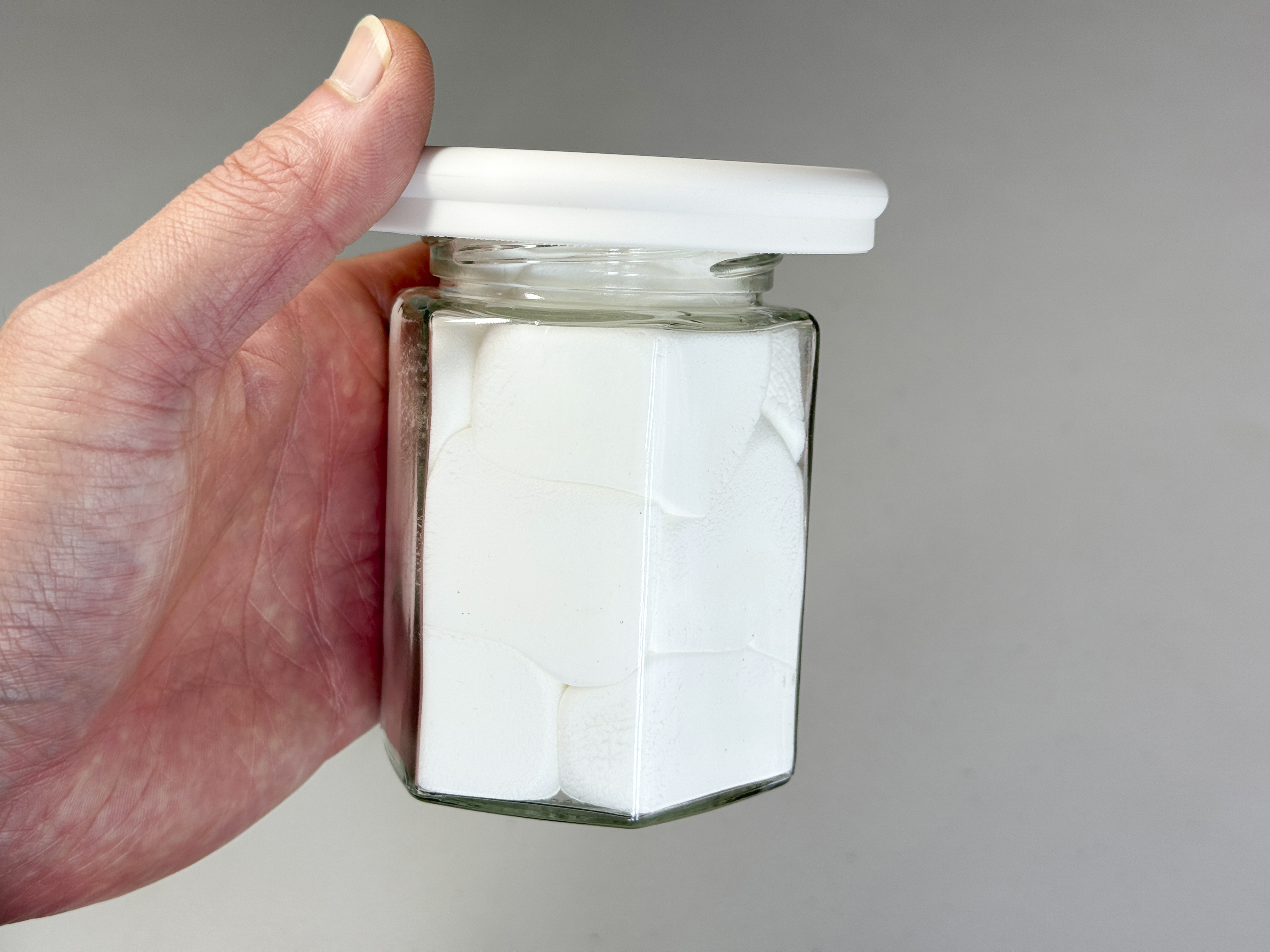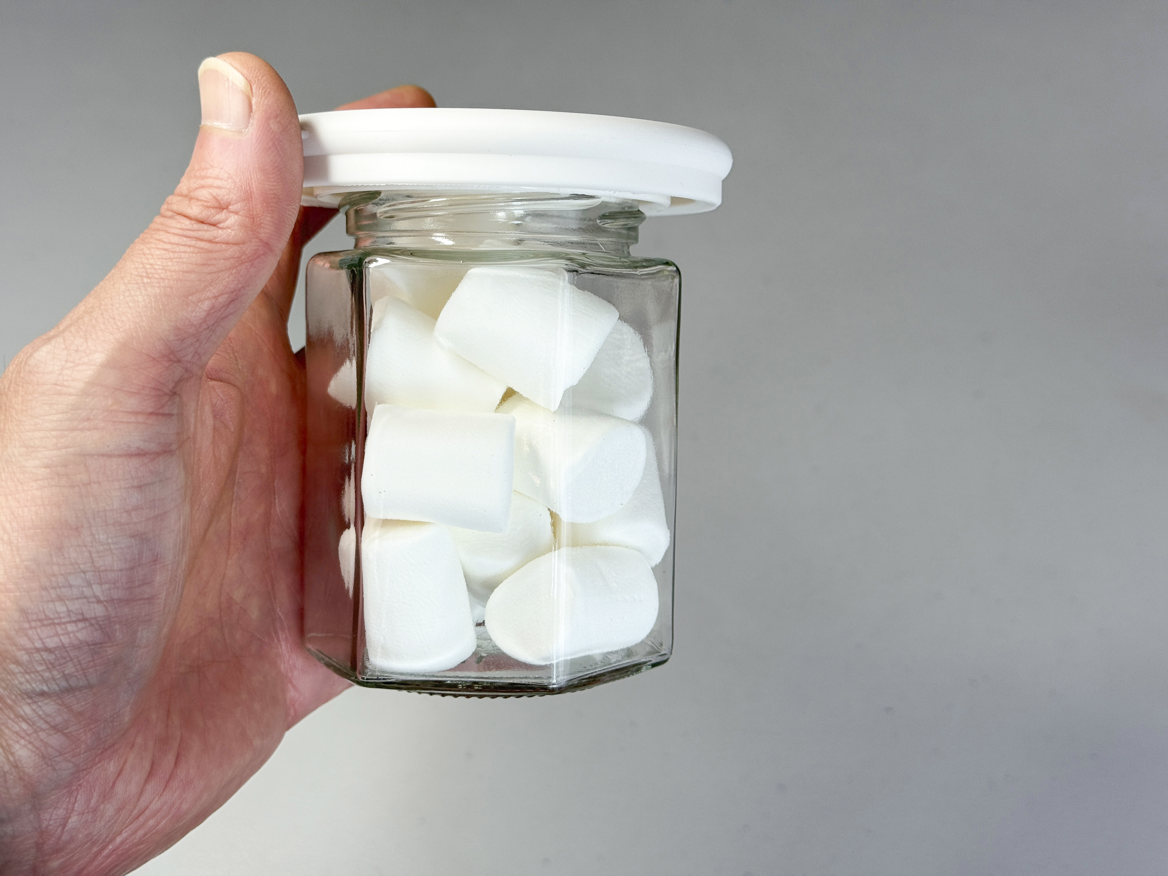 手持ちの保存瓶にかぶせて付属のポンプで吸引するだけで真空完了の簡単工程ながら、その密封力は一目瞭然です。マシュマロで実験したところ真空後は気圧の変化でマシュマロはパンパンに膨らみました。この真空効果により香り・食感が続き、食材が傷む原因である酸化を防ぎ、密閉効果で乾燥やにおい移りを防ぎます。