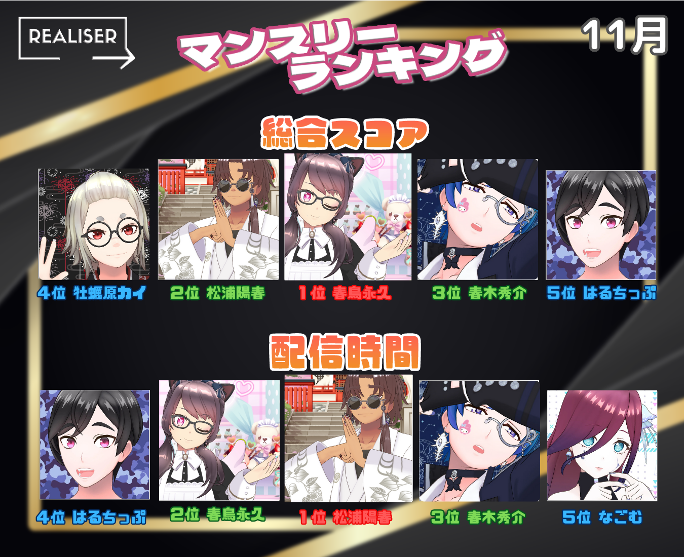 バーチャルライブ配信アプリ「REALITY(リアリティ)」にて活躍するVライバー事務所「REALISER(レアリゼ)」が2025年11月のマンスリーランキングの結果を発表致しました。