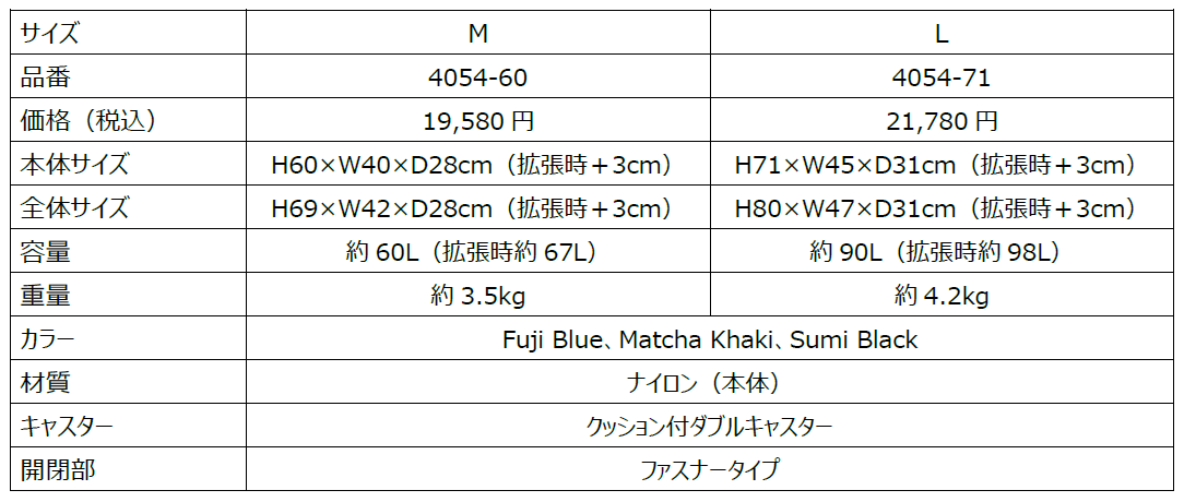 M・Lサイズでは、SS・Sサイズにはない機能として、収納量を調整できる約3cmの容量拡張機能や、サイドハンドルと台座、クッション付きダブルキャスター(取り外し不可)を採用しています。カラー展開は、Fuji BlueとMatcha KhakiをSS~Lの全4サイズで展開し、M・Lサイズ限定で新たにSumi Black(スミブラック)を追加。Washi IvoryはSS・Sサイズのみで継続展開します。価格は、Mサイズが19,580円、Lサイズが21,780円(いずれも税込)です。