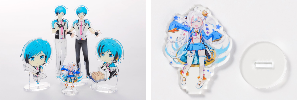 これまでは、正円や長方形といった決まった形状でのみ作成可能でしたが、この度、デザインに沿った形状のアクリルグッズが制作可能となりました。オリジナルのアクリルグッズが1点から作成可能です。