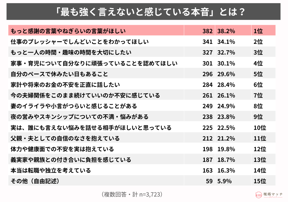 最も強く感じている本音として選ばれたのも、やはり「もっと感謝・ねぎらいの言葉がほしい」でした。