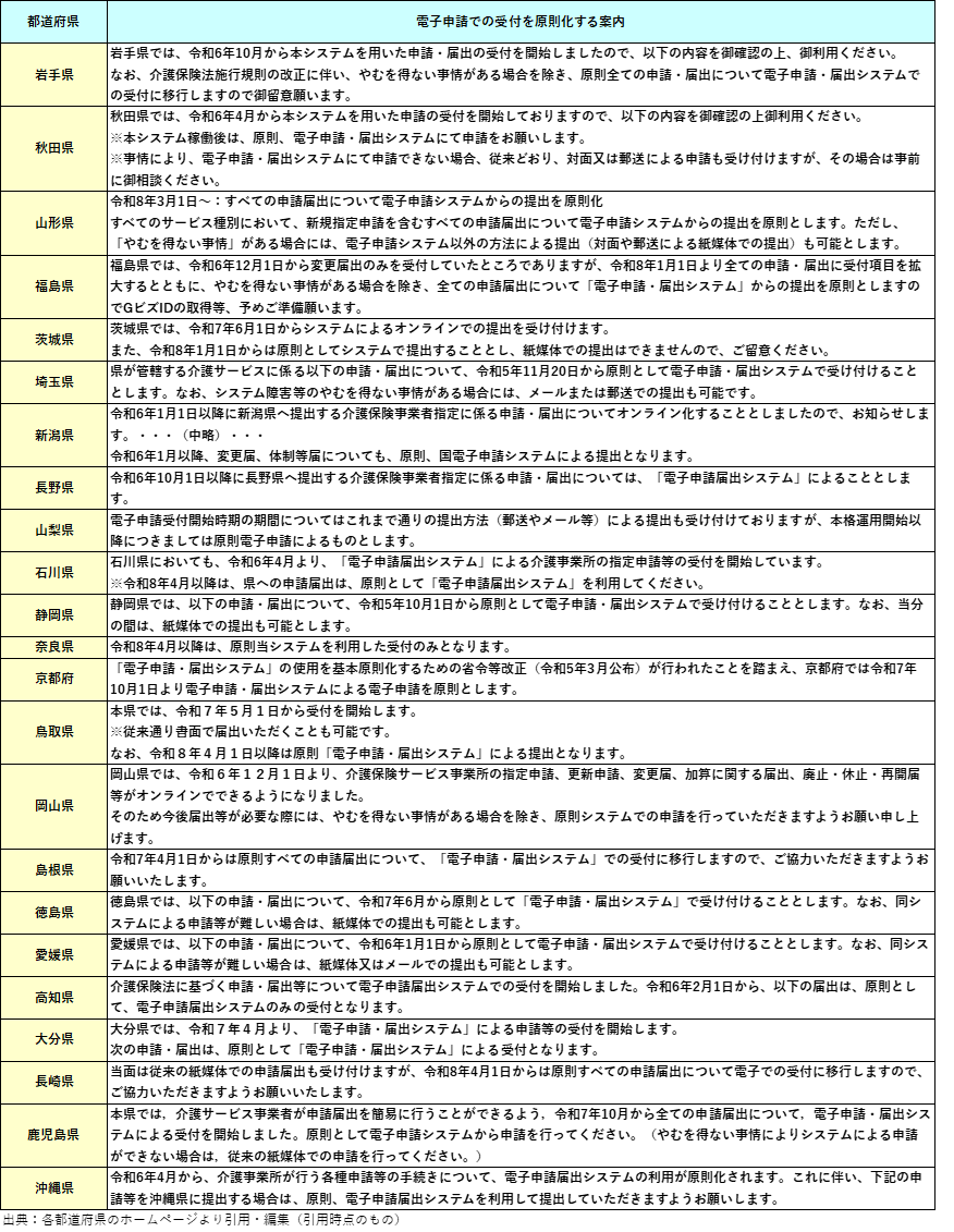 ・山形県:令和7年12月1日から、電子申請・届出システムでの運用を開始して、当面は紙媒体での提出と電子申請システムによる提出の併用期間として、従来の方法(紙媒体)による提出も認める。令和8年3月1日からすべての申請届出について電子申請・届出システムからの提出を原則化する。