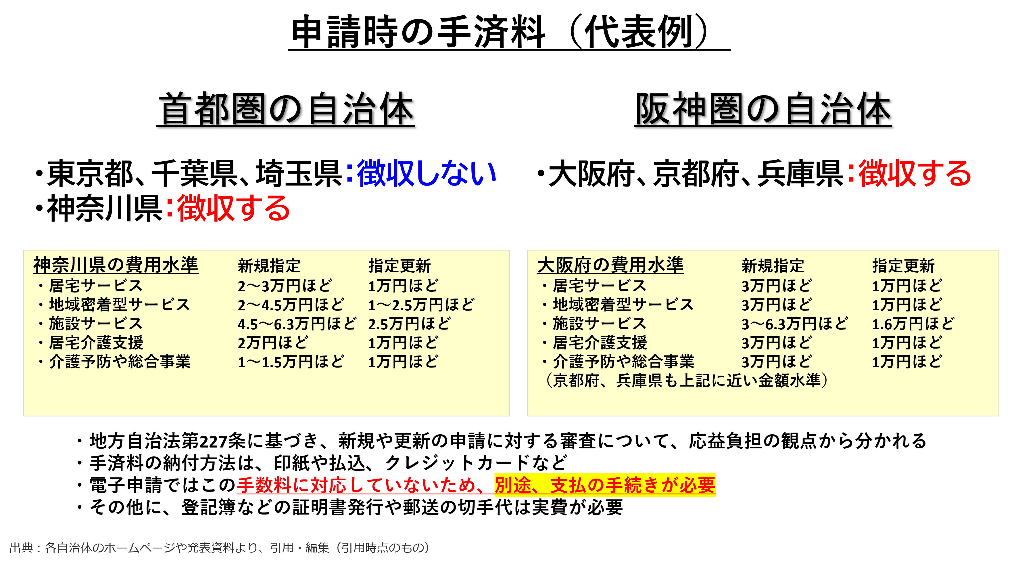 介護事業所の新規指定や更新申請の際には、手数料を徴収する自治体もあり、これは介護事業所の指定業務の事務に係る応益負担の観点から、自治体によって分かれます。